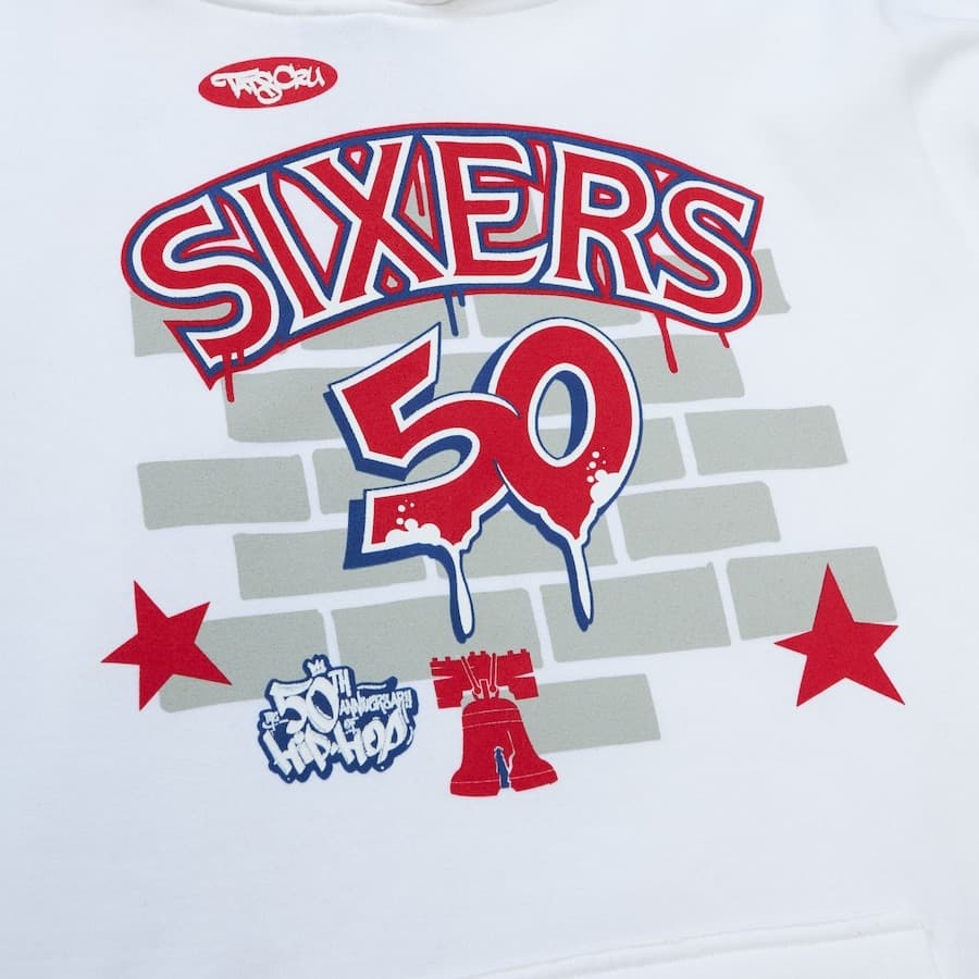 Худи Mitchell & Ness White Philadelphia 76ers Hardwood Classics Tats Cru The 50th Anniversary of Hip-Hop Brick Pullover Hoodie Цена Худи Mitchell & Ness White Philadelphia 76ers Hardwood Classics Tats Cru The 50th Anniversary of Hip-Hop Brick Pullover Hoodie - оригинальные товары спортивных брендов в интернет-магазине Слэмданк. Mitchell & Ness NBA