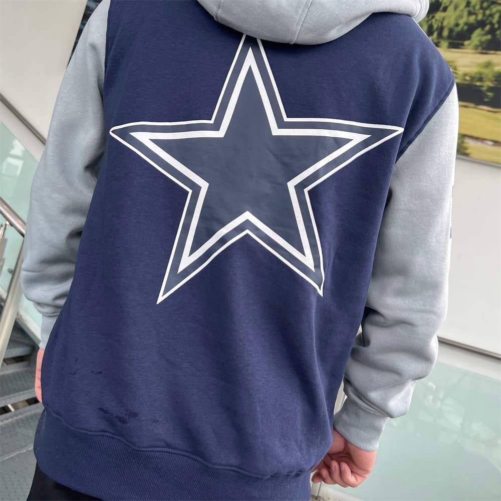 Худи Starter NFL Cowboys Navy Hoodie синего цвета обладает свободным кроем с серой задней частью, рукавами и капюшоном. На передней части располагается принт в цветах команды NFL Ковбойс, на плечах и спине также располагаются логотипы клуба из Далласа. На запястье расположен вышитый логотип Starter. Худи прекрасно подходит для тренировок, так как не ограничивает движений и изготовлено из быстросохнущего полиэстера и хлопка.