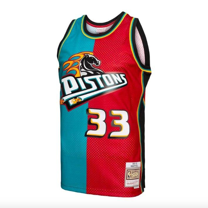 - Баскетбольная джерси 1999-00 Detroit Pistons #33 Grant Hill Mitchell & Ness Split Teal/Red Jersey
