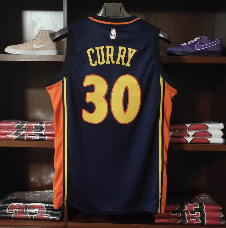 Тёмно-синяя расцветка джерси баскетбольного игрока Стефена Карри из команды Голден Стейт Уорриорз сезона 2009-10 гг. На груди прозвище команды Warriors и номер 30, который дублируется на спине вместе с фамилией Curry.