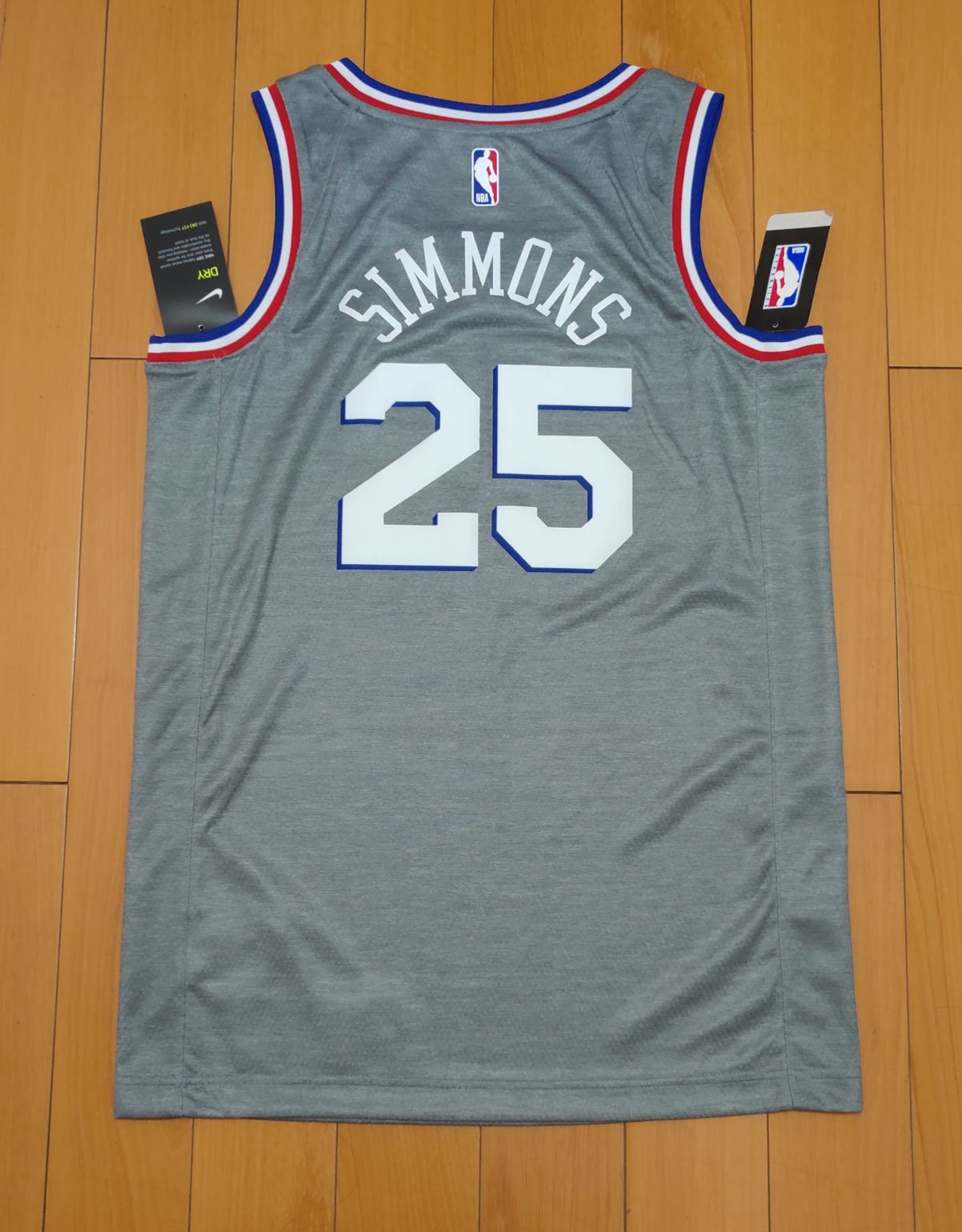 Серая расцветка джерси баскетбольного игрока Бэна Симмонса из команды Фила Сиксерс. Издание City Edition. Номер 25 с обоих сторон и инициалы.
