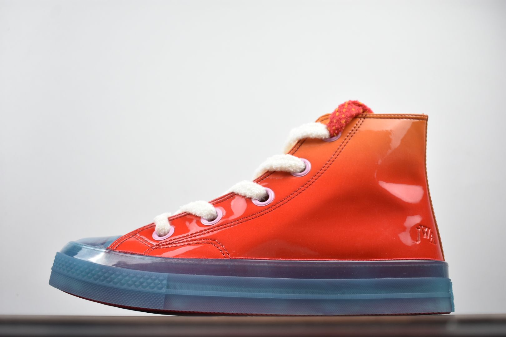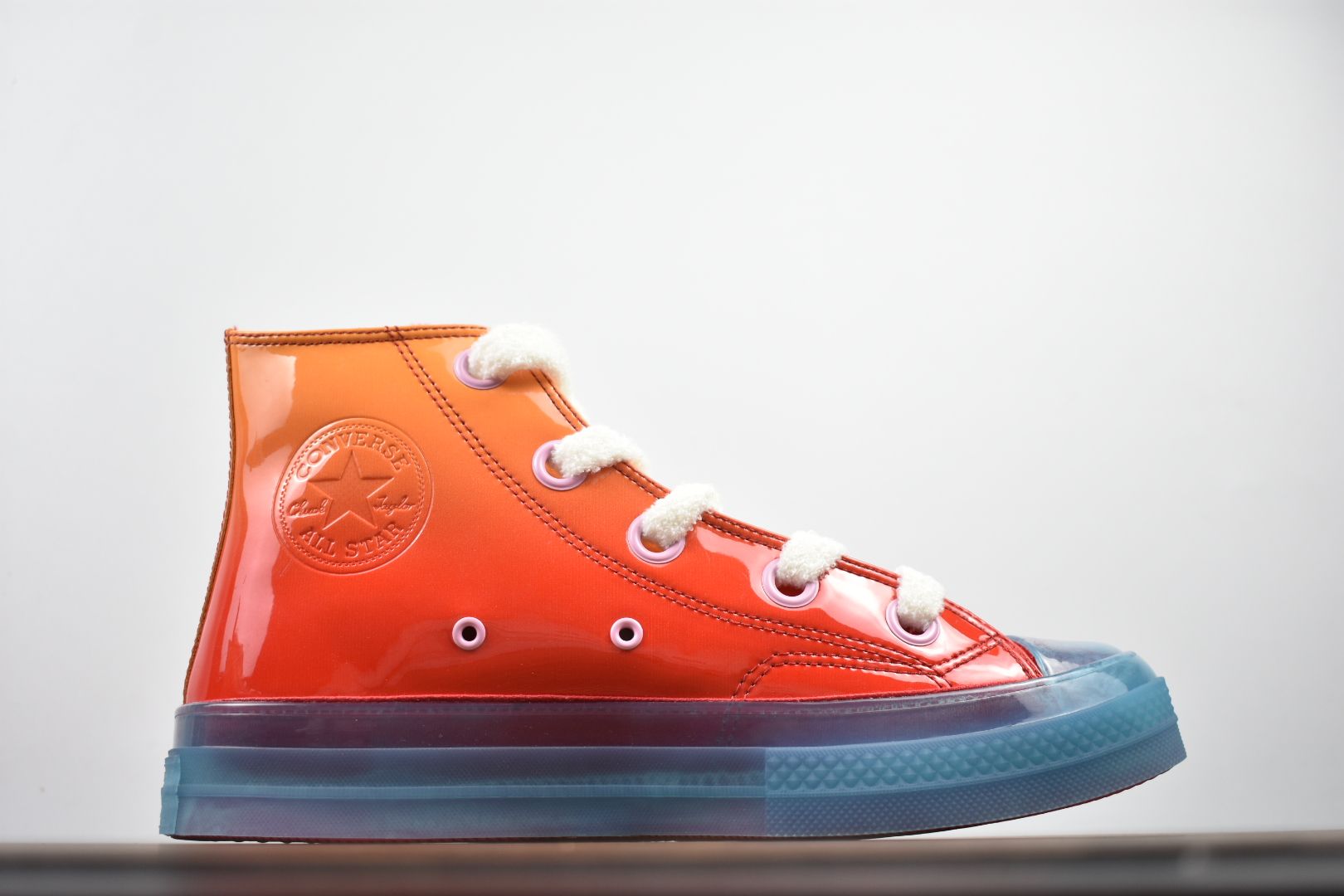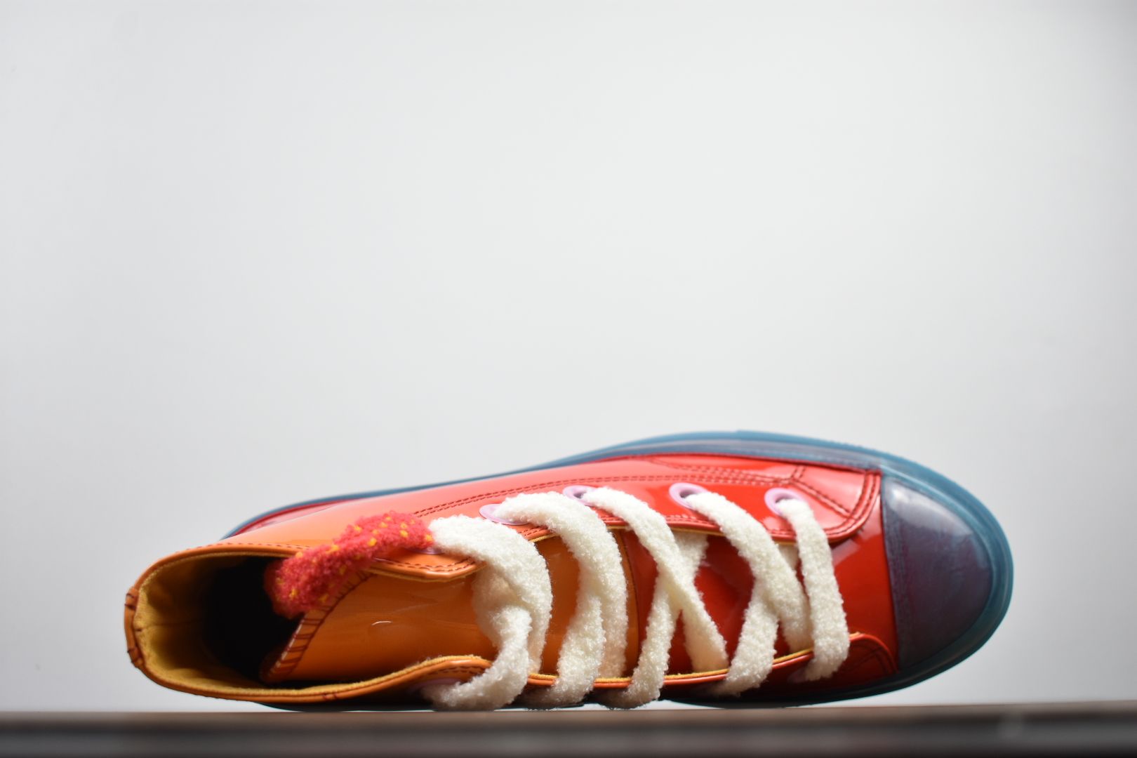 Культовая британская модель Конверс Чак 70 совместно с дизайнером Джонатаном Андерсоном. Стиль и блеск шипит от лакированной кожи по основе модели, переливаясь сверху к подошве в ярком оранжевом тоне. Прозрачная синяя мидсоль создаёт уникальный эффект градиента. Негабаритные люверсы оснащены широкими нечёткими кружевами, вдохновленными фасадом штукатурки зданий Сан-Франциско.- Цвета: Kumquat