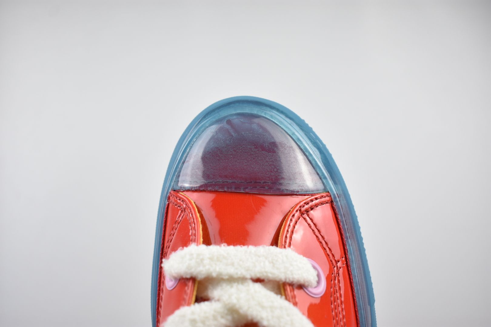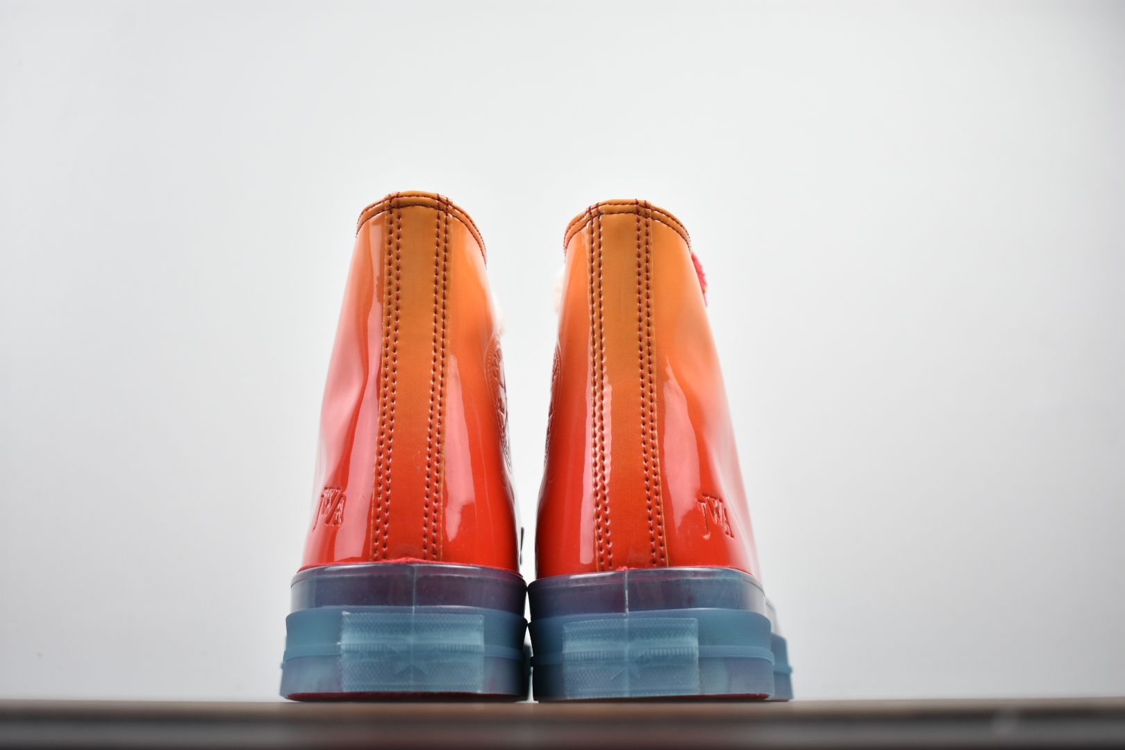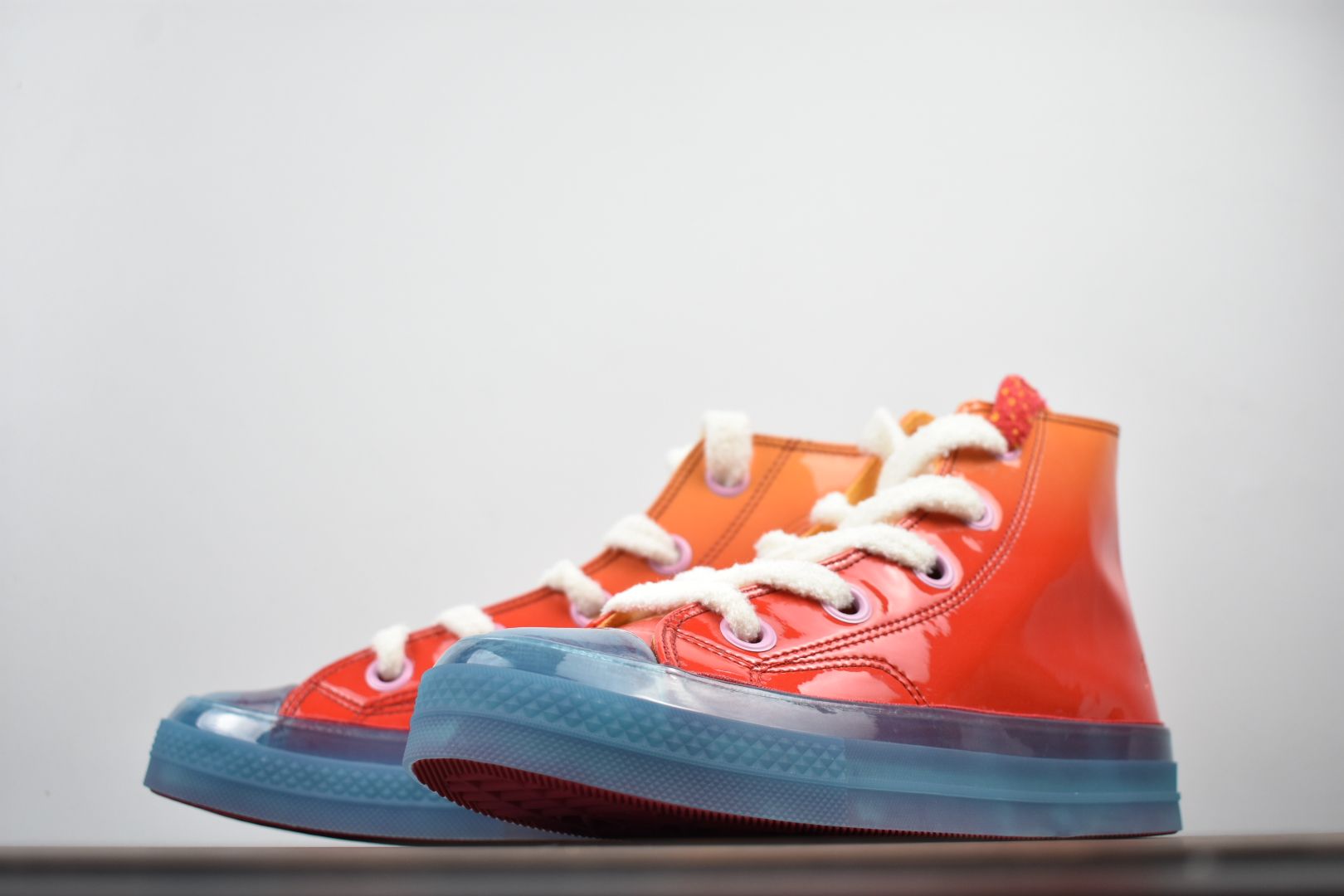 Культовая британская модель Конверс Чак 70 совместно с дизайнером Джонатаном Андерсоном. Стиль и блеск шипит от лакированной кожи по основе модели, переливаясь сверху к подошве в ярком оранжевом тоне. Прозрачная синяя мидсоль создаёт уникальный эффект градиента. Негабаритные люверсы оснащены широкими нечёткими кружевами, вдохновленными фасадом штукатурки зданий Сан-Франциско.- Цвета: Kumquat