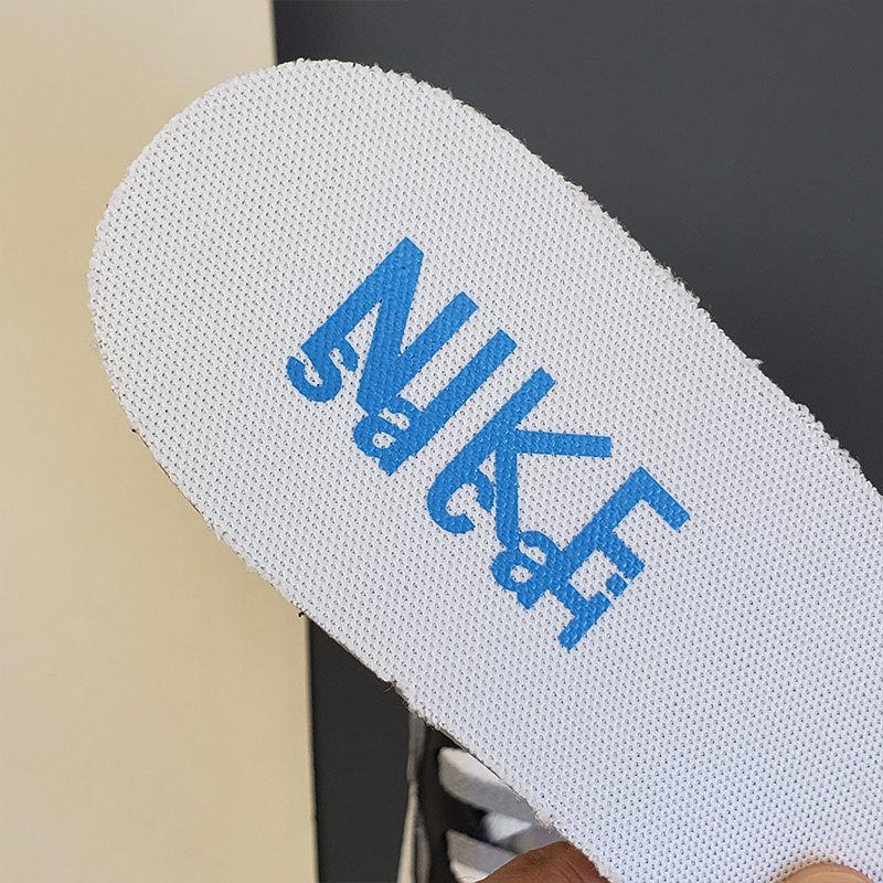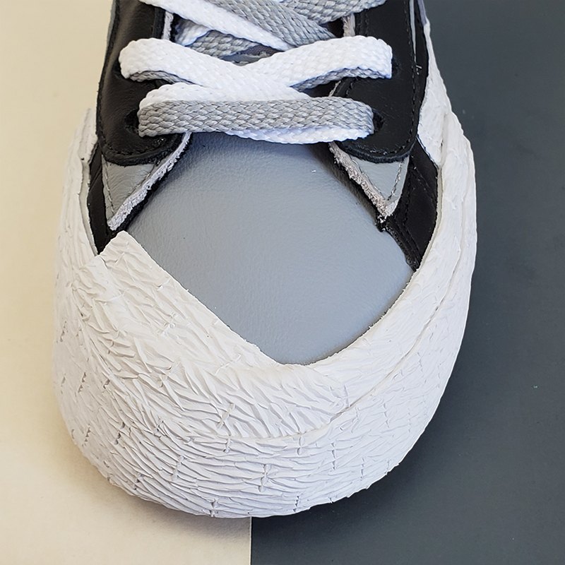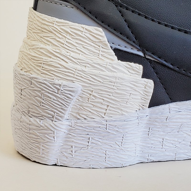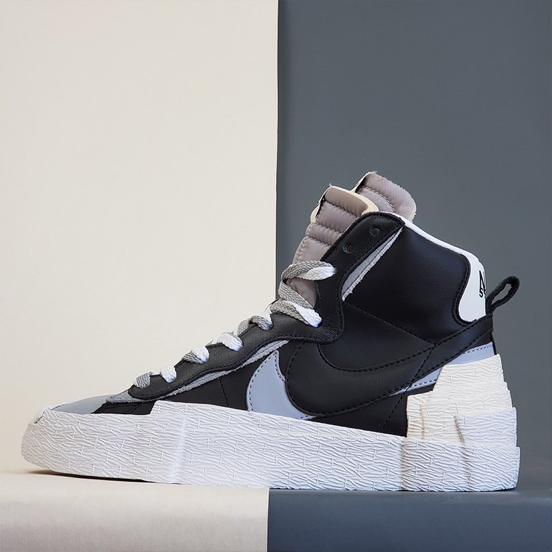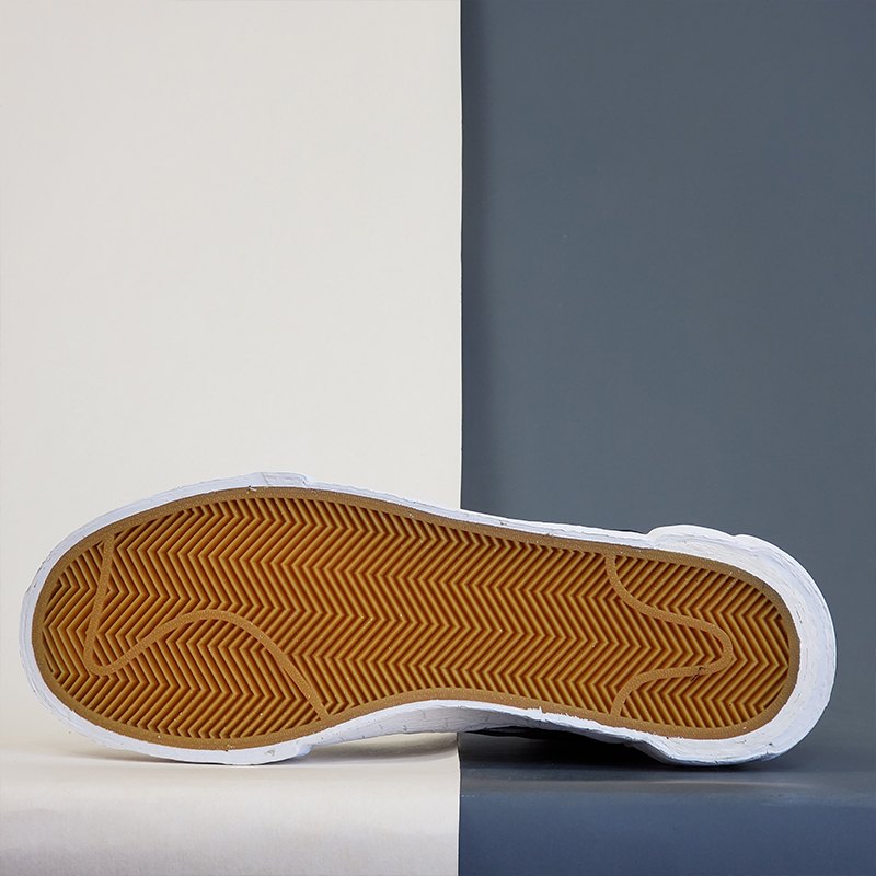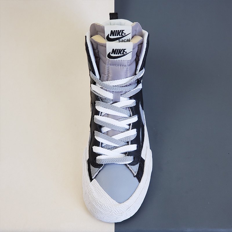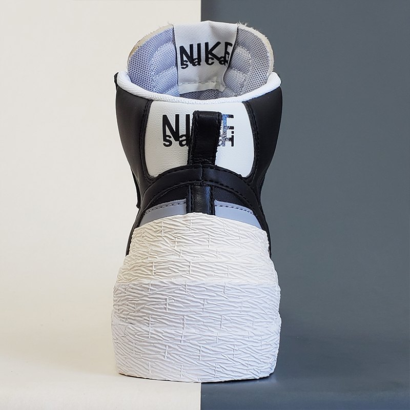 Sacai x Nike Blazer Mid переводит эстетику деконструированного японского модного бренда, используя двойные элементы дизайна. Представленный в октябре 2019 года, черный кожаный верх этой версии имеет два язычка с открытыми подкладками, многослойные свуши и сложенные воронки для глаз. Кобрендинг на каблуке. Текстурированные резиновые панели появляются на боковине. Фирменная чашечка остается классической с рисунком в виде «елочки».- Цвета: Black/White-Wolf Grey-Black