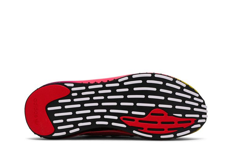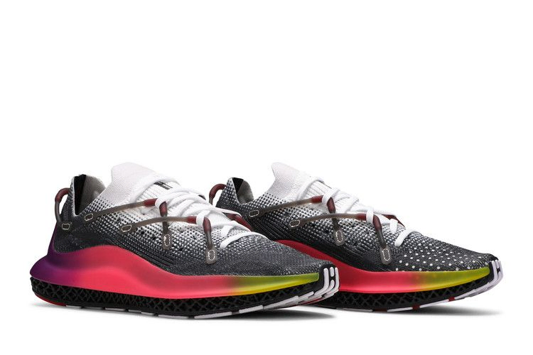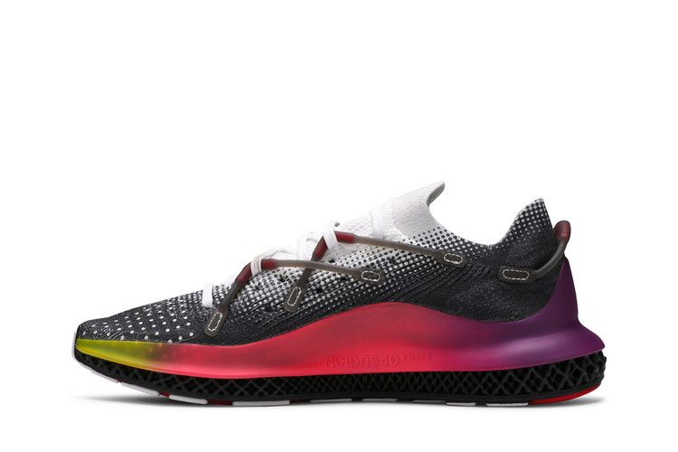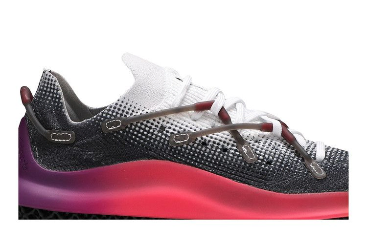 В модели adidas 4D Fusio "Black Ultra Purple" текстильный верх кроссовок Primeknit имеет эффект выцветания, переходящий от белого к темно-серому. Аналогичный градиентный рисунок нанесен на клетку из TPU, опоясывающую межподошву, с фиолетовым оттенком вокруг пятки и контрастным желтым на носке. Жидкая отделка компенсируется строгой черной подошвой 4D, выполненной в виде решетчатой структуры, созданной на основе данных путем смешивания света, кислорода и жидкой смолы.