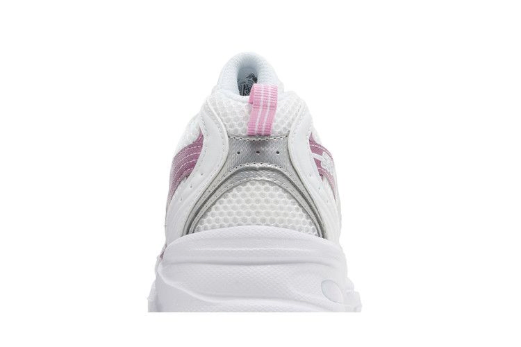 Модель New Balance 530 "Pink Sugar" выполнена из белой сетки с открытыми ячейками в верхней части, укрепленной накладками из искусственной кожи белого и розового металлика. Серебристый логотип "N" украшает четверть панели, а тканая бирка NB Running расположена на язычке. Легкая амортизация достигается за счет скульптурной подошвы ABZORB, укрепленной черной резиновой подошвой.