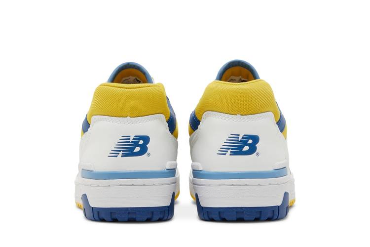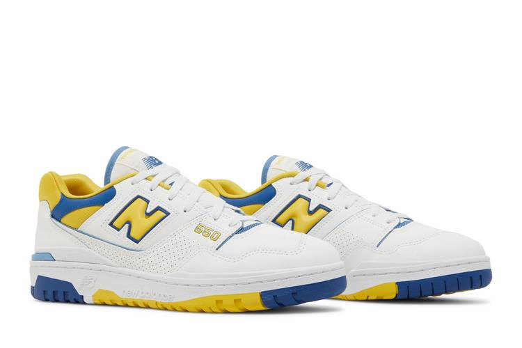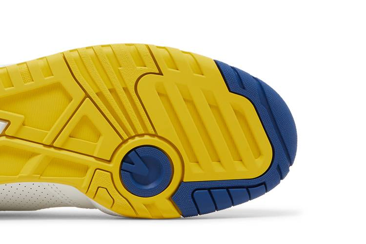 New Balance 550 'Honeycomb Heritage Blue' обновляет двухцветную модель 80-х годов. Гладкая белая кожа использована для верха, микроперфорированная накладка на средней части стопы и фирменный логотип "N" канареечно-желтого цвета. Солнечный оттенок повторяется на мягком сетчатом воротнике, усиленном синими кожаными деталями для контраста. Подошва из прочной резины с заметным клином из пеноматериала на медиальной стороне.