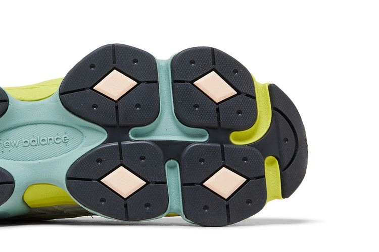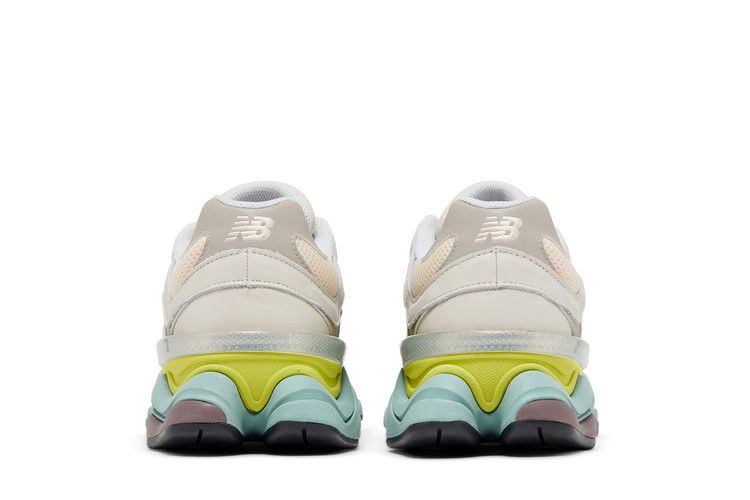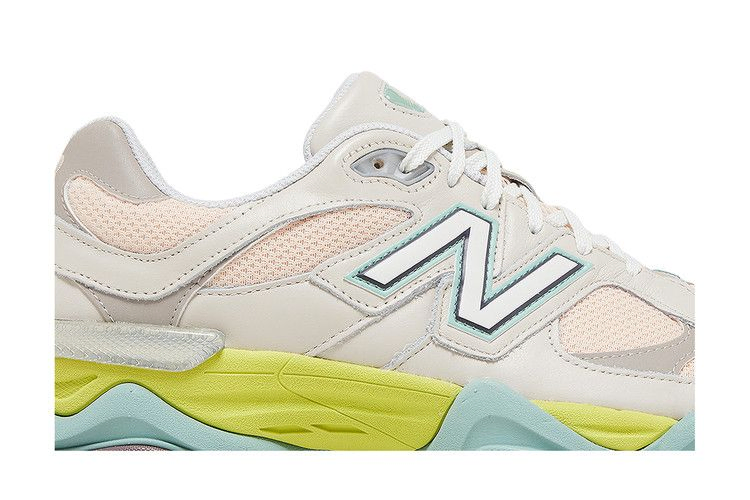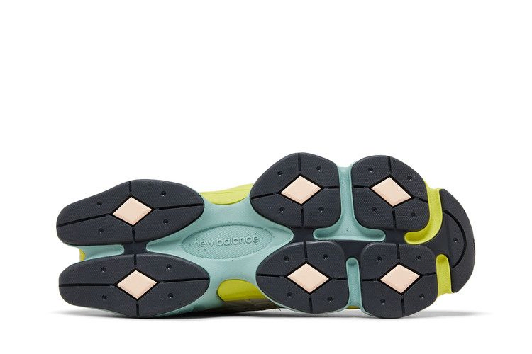 Модель New Balance 9060 "Moonbeam Vintage Rose" отличается неоново-зеленым и ярко-аква-синим цветом межподошвы ABZORB, оснащенной полупрозрачной накладкой CR в пятке для повышения устойчивости. Подошва из резины с ромбовидным рисунком темно-серого цвета обеспечивает надежное сцепление с поверхностью. Верх из сетки кремового цвета, укрепленный бледно-серыми кожаными накладками и акцентированный боковым логотипом 'N', выполненным в мягком тиловом оттенке.