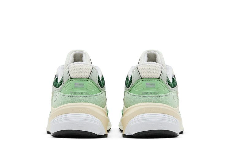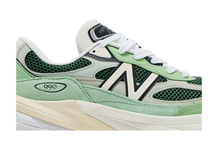 Модель New Balance 990v6 Made in USA "Avocado Natural Mint" выполнена из сетки с открытыми порами темно-изумрудного оттенка. Замша мятно-зеленого цвета использована на наглазнике и брызговике, а более приглушенный оттенок зеленого отличает накладки из искусственной кожи, укрепляющие среднюю часть стопы. Фирменные элементы включают обрезанный логотип 'N' и надпись 'Made in USA' на TPU язычке пятки. Кроссовки поддерживаются промежуточной подошвой ENCAP, изготовленной из пены FuelCell и полиуретанового обода.- Артикул: U990AB6