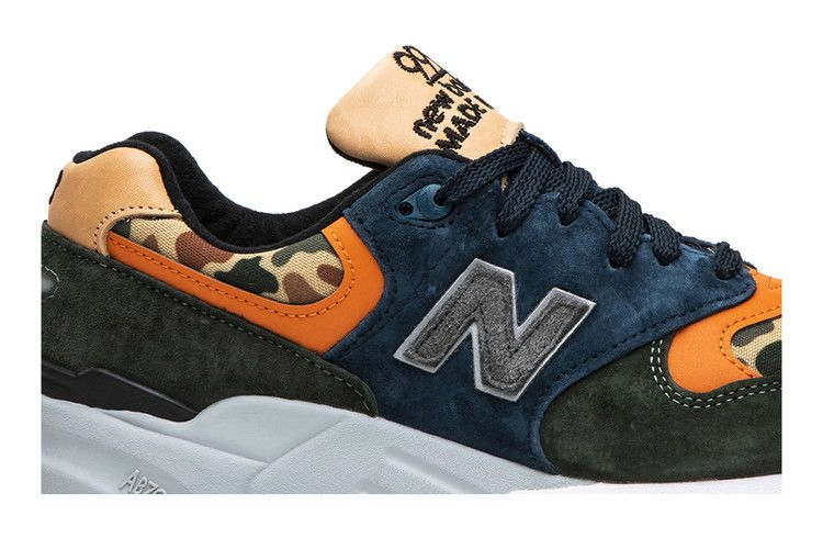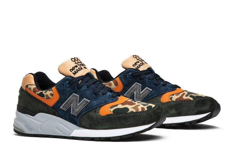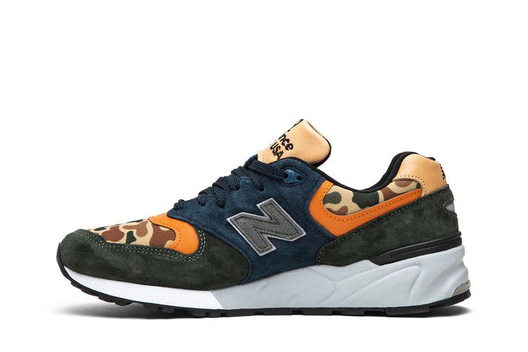 Модель New Balance 999 'Duck Camo' была разработана в знак уважения к охоте на уток. Верх кроссовок выполнен в осенней расцветке Duck Camo, а накладки из оливковой и синей замши. На язычке и пятке кроссовка используется кожа цвета загара, серебристый логотип New Balance на средней части стопы и двухцветная серая межподошва с амортизацией Abzorb.