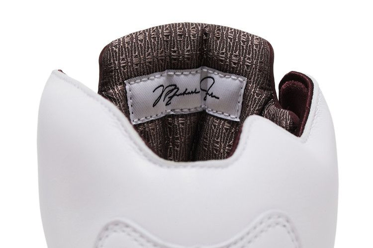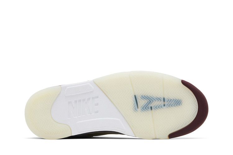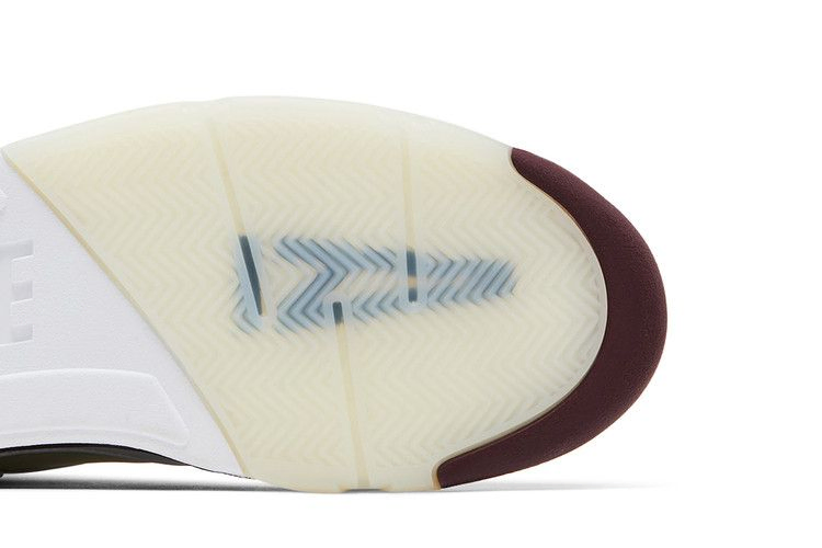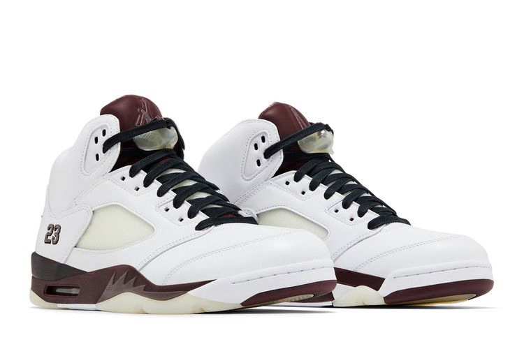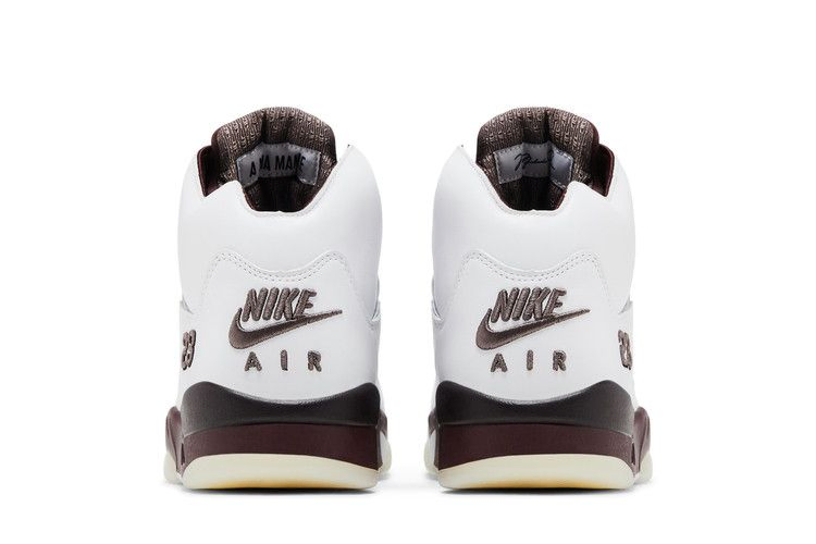 Модель A Ma Maniere x Air Jordan 5 "Black Collective" выполнена из белой кожи с предварительно пожелтевшей сеткой на четверти и вышитой надписью "23" на боковой пятке. Внутренняя отделка выполнена из стеганого текстиля насыщенного бордового оттенка и сочетается с логотипом Nike Air на пятке и язычке. На светоотражающем язычке изображен логотип Jumpman на правом ботинке и логотип A Ma Maniere на левом. Дополнительный бордовый оттенок пришелся на полиуретановую промежуточную подошву, украшенную тональными деталями в виде акульих зубов и поддерживаемую состаренной полупрозрачной резиновой подошвой.