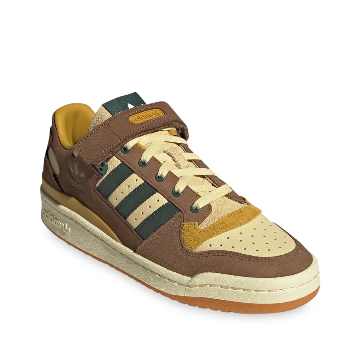 Модель adidas Forum Low Yoyogi Park подчеркивает сдержанную отделку ретро-силуэта, воплощающего громоздкий баскетбольный стиль 80-х. Традиционные шнурки в сочетании с регулируемым ремешком на щиколотке фиксируют верх из кожи, украшенный тремя полосками из ворсистой замши. Низкий верх установлен на прочную резиновую подошву с открытым клином EVA на медиальной стороне. Под ногами располагается резиновая подошва с круговым рисунком сцепления и контрастной красной точкой опоры.- Цвета: Brown/Mustard/Dark Green