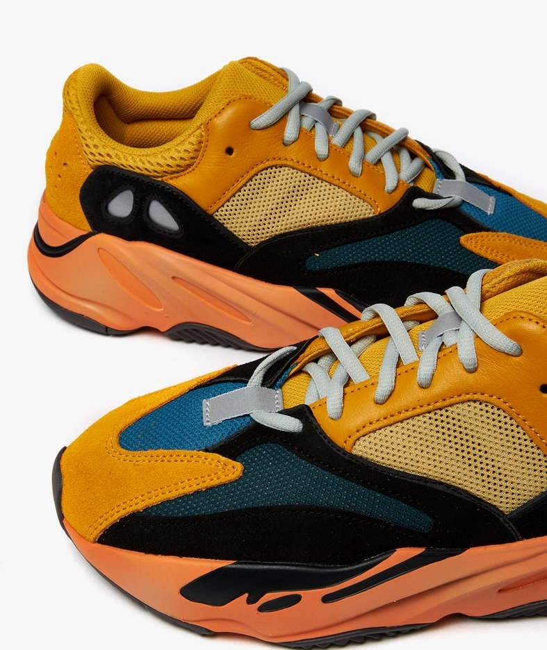 Adidas Yeezy Boost 700 'Sun' предлагает яркую цветовую схему, подчеркивающую многослойность силуэта. Большая часть сетчатого и кожаного верха выполнена в различных оттенках желтого, контрастируя с черным замшевым покрытием, которое продолжается до сетчатых вставок на передней части стопы синего и бирюзового цветов. Завершают силуэт скульптурная двухцветная мидсоль Boost во всю длину, с контрастным протектором, который улучшает сцепление.- Цвет: Sun/Sun/Sun