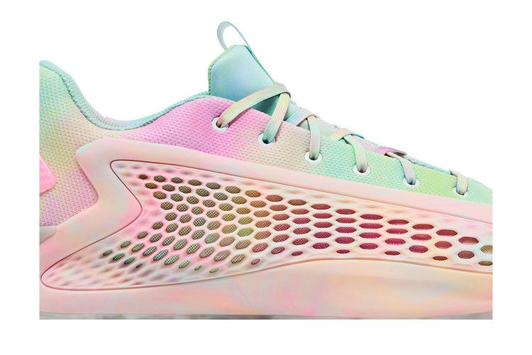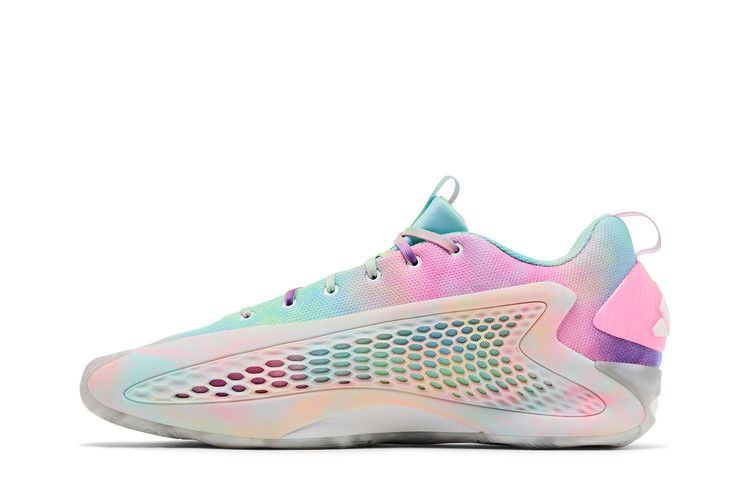 Модель adidas AE 1 Low '3SSB' - это главная фирменная обувь Энтони Эдвардса, выполненная в пастельной цветовой гамме. Сетчатый верх окрашен в градиентную смесь бирюзового, зеленого, голубого и лавандового цветов. Стабильность и сдерживание обеспечиваются генерирующими крыльями поддержки из TPU с нежно-розовой отделкой и деформированной сотовой структурой для улучшения воздухопроницаемости. Эффективная подошва Lightstrike с амортизацией Light Boost в носочной и пяточной частях, а также резиновая подошва с сцеплением "елочка".
