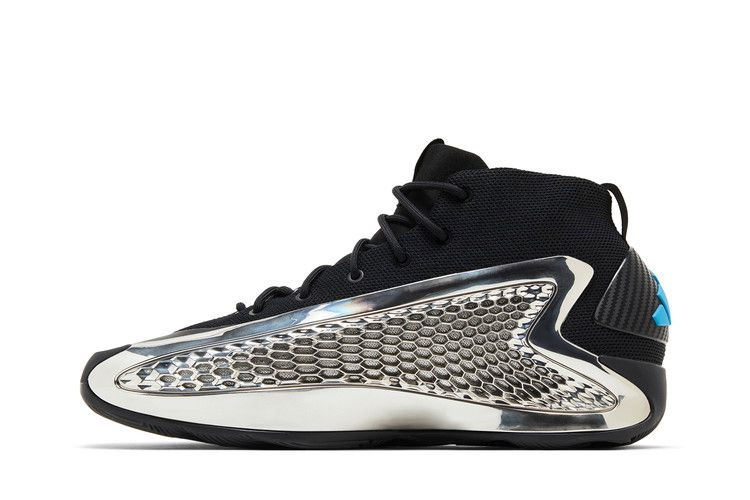 Модель adidas AE 1 "Silver Metallic" имеет черный сетчатый верх с вплавленным мыском и крыльями поддержки, сверкающими хромом. На спойлере пятки из TPU, украшенном синим логотипом adidas в виде трех полос, используется искусственное углеродное волокно. Личный логотип Энтони Эдвардса украшает язычок в том же аквамариновом оттенке. Кроссовки стоят на промежуточной подошве Lightstrike в клетку с отзывчивой амортизацией Boost в пятке.