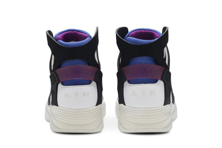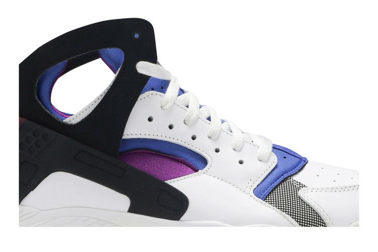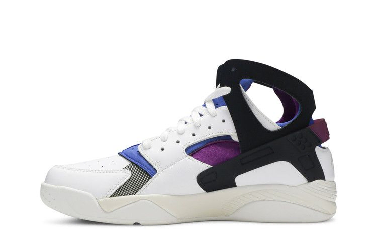 Впервые выпущенные в 1992 году Air Flight Huarache были созданы благодаря увлечению Тинкера Хэтфилда и Эрика Авара водными лыжами. Air Flight Huarache PRM QS имеют верх из белой кожи премиум-класса с неопреновым экзоскелетом, перфорированную носочную часть для воздухопроницаемости и открытую лодыжку. Кроссовки также оснащены формованным пяточным каркасом для поддержки, встроенным блоком Air, обеспечивающим эффективную амортизацию, и акцентами Lyon Blue и Bold Berry, которые напоминают об оригинальной расцветке.