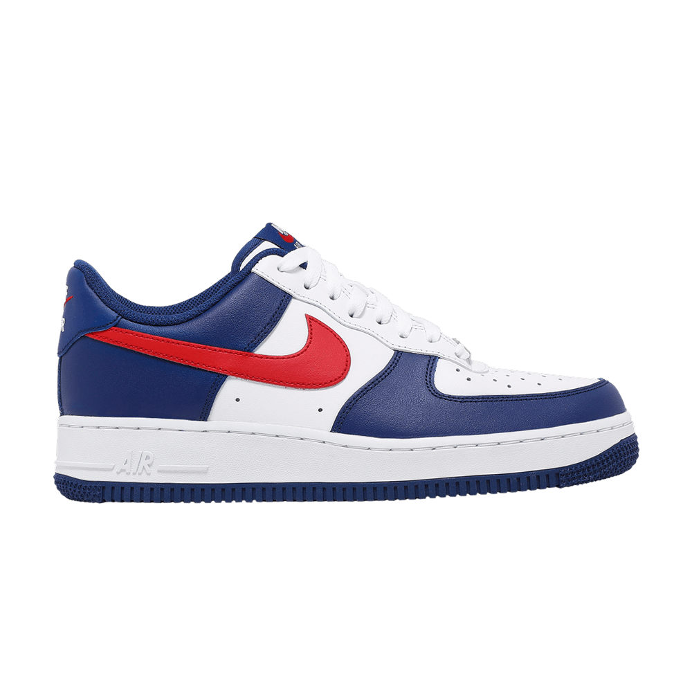 Кроссовки Nike Air Force 1 '07 'USA' одеты в знакомое сочетание национальных цветов. Кожаный верх сочетает в себе белые носочную часть и четверть панели с контрастными накладками цвета Deep Royal. Фирменный логотип Swoosh выполнен в смелом университетском красном цвете, а на пятке и язычке красуется соответствующий микробрендинг. Белая межподошва из пеноматериала с амортизацией Air в пятке опирается на синюю резиновую подошву с поворотной точкой.