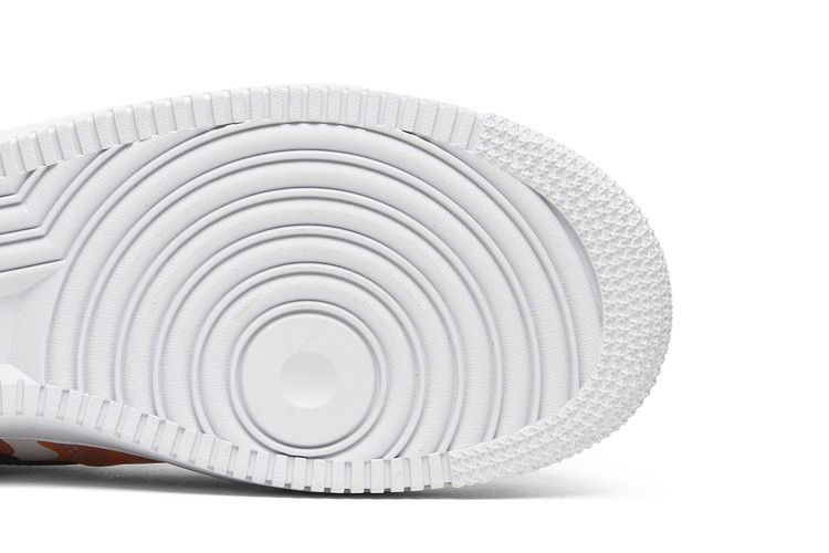 Nike привнесла в Air Force 1 Low свой стиль Country Camo, сочетающий оранжевые, черные и белые оттенки в кожаной отделке верха. Нейлоновый язычок добавляет военного эффекта, а кроссовки опираются на белую промежуточную подошву с воздушным наполнителем. Сплошной черный Swoosh и пяточная стойка создают контраст, а брендинг на пятке добавляет красный оттенок.