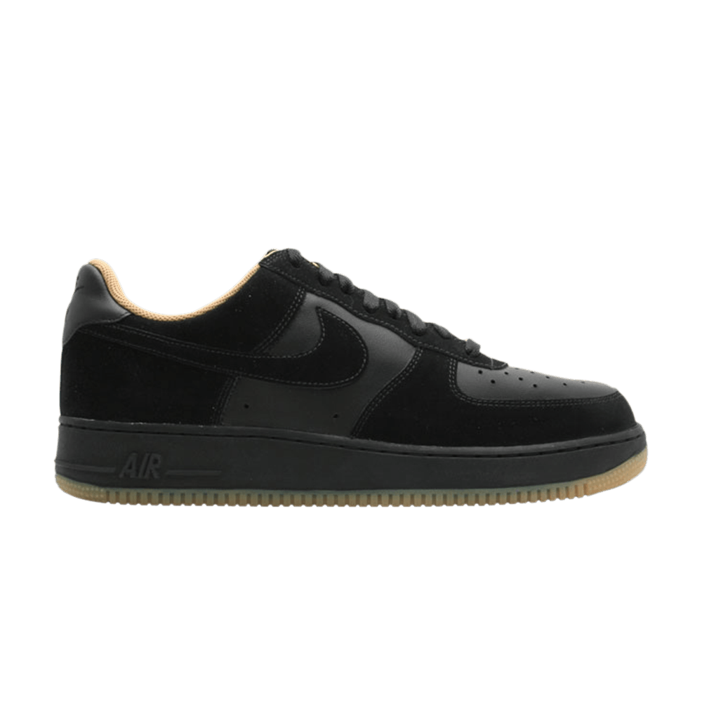 Nike Air Force 1 были выпущены в 1982 году и стали первыми баскетбольными кроссовками с амортизацией Air-Sole. В этом варианте верхняя часть кроссовок полностью черная, а текстуры премиум-класса смешаны для интереса. Подкладка выполнена в золотистом цвете, а логотип "LE" на внутренней стороне обозначает статус ограниченной серии. Внизу амортизация Air-Sole и подошва из резины усиливают дизайн.
