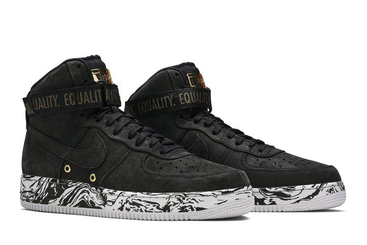 Эта лимитированная модель Air Force 1 High 'BHM' стала частью коллекции Nike 2017 года Black History Month. Модель отличается черно-белым мраморным узором на межподошве, а также золотой надписью EQUALITY на ремешке на щиколотке. Верх кроссовок выполнен из черного нубука премиум-класса, на боковой стенке имеются золотые вентиляционные отверстия, а подошва оснащена амортизирующей системой Air.