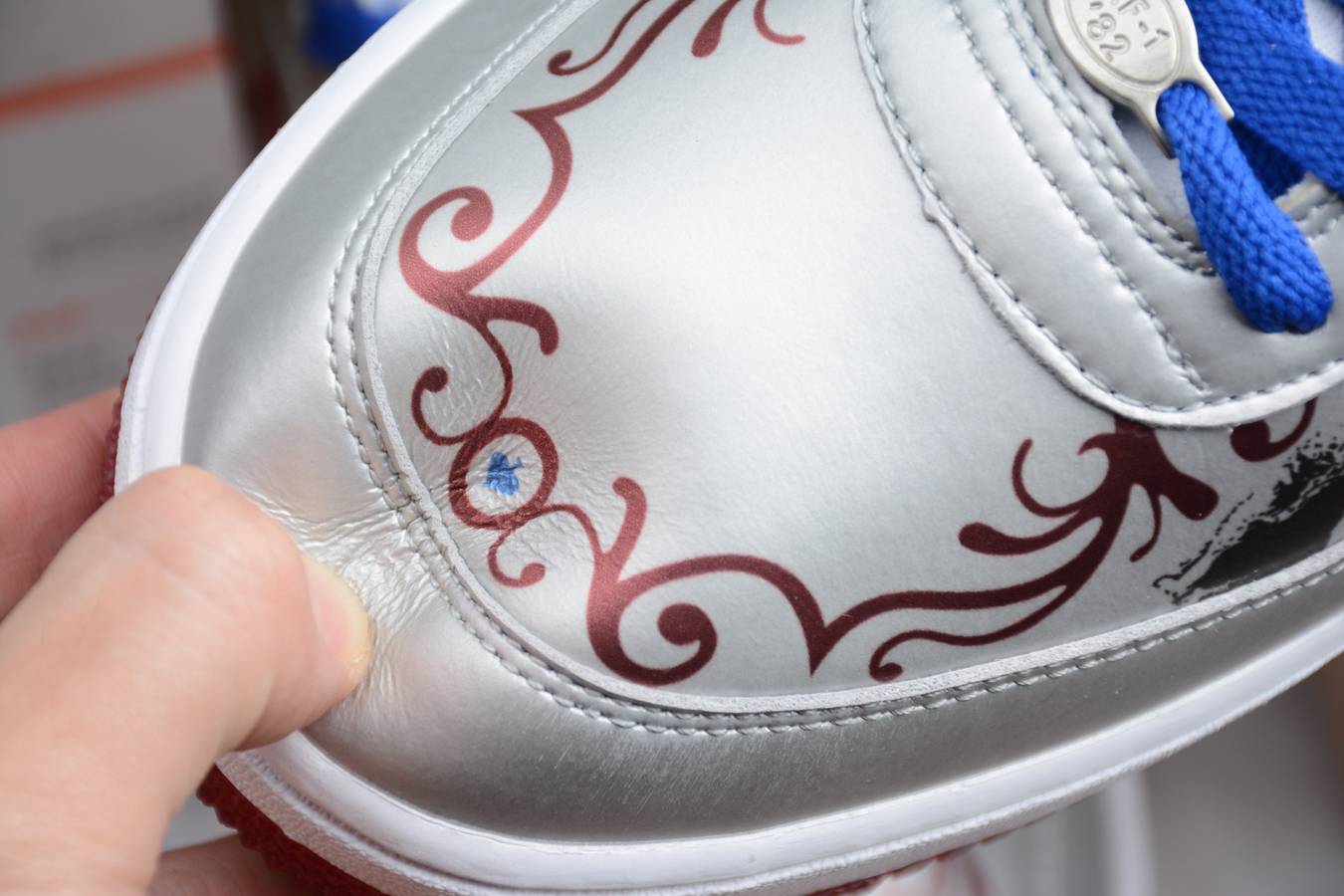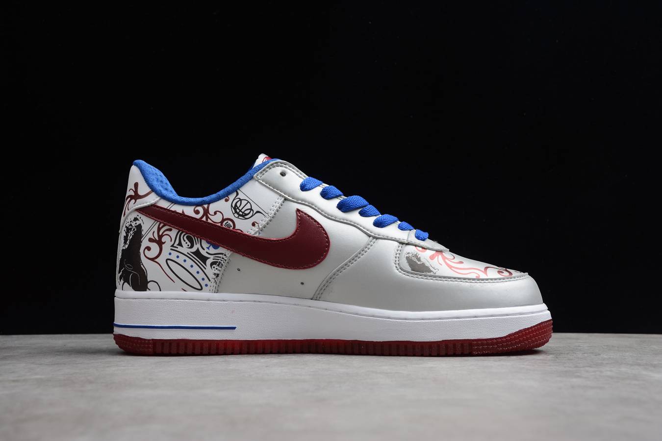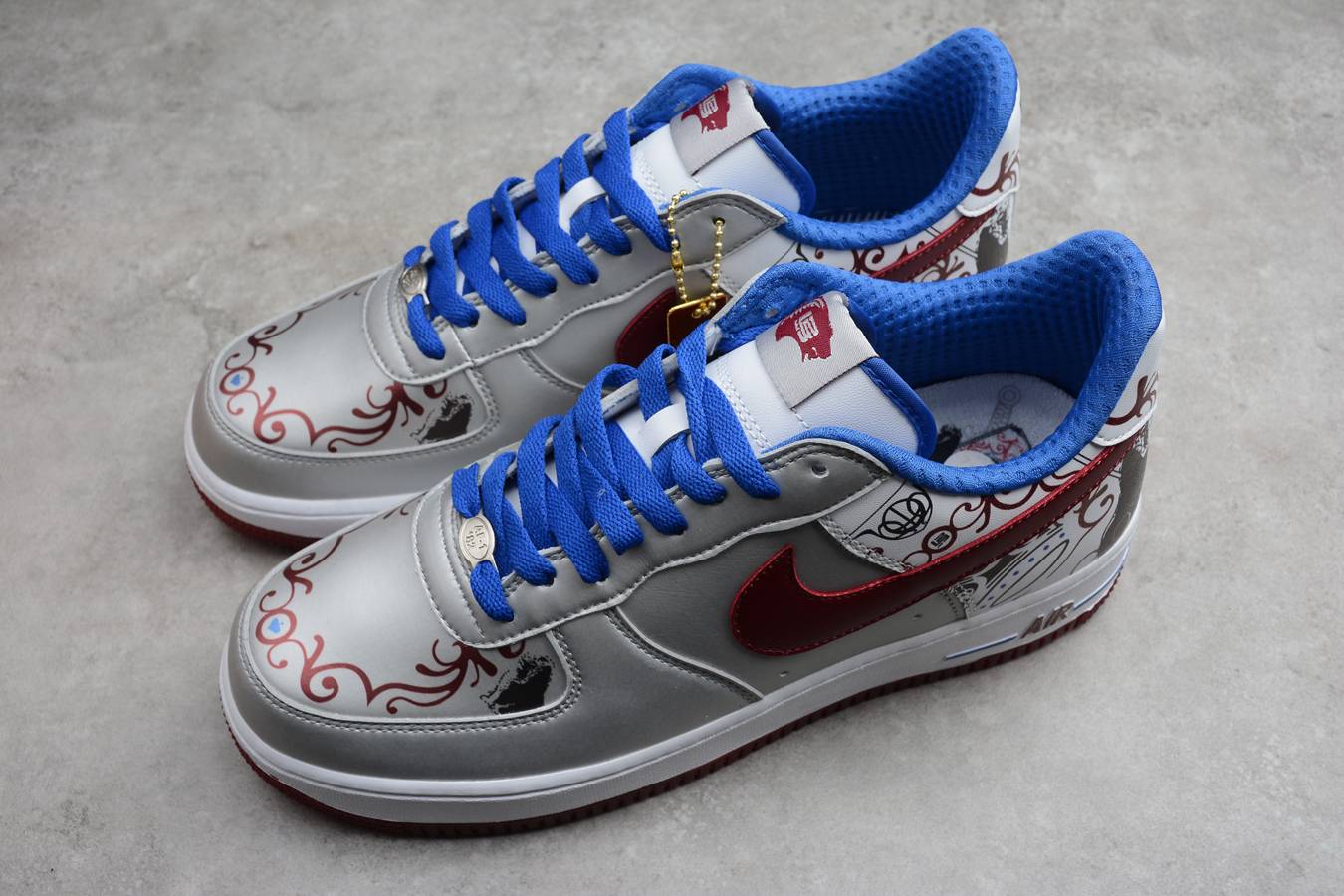 Низкая версия первых Форсов, оформленных в честь Леброна Джеймса. Металлический цвет основы, синие шнурки и внутренняя ткань, а низ подошвы и Свуш - бордового цвета.- Цвета: Metallic Silver/Team Red-Varsite Royal-White