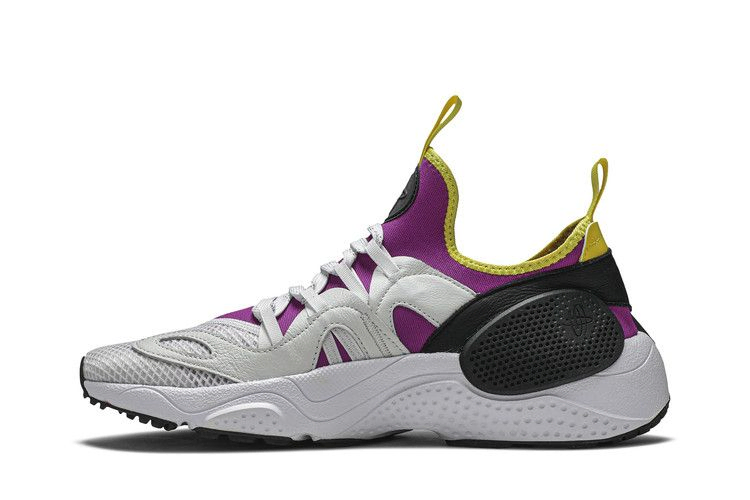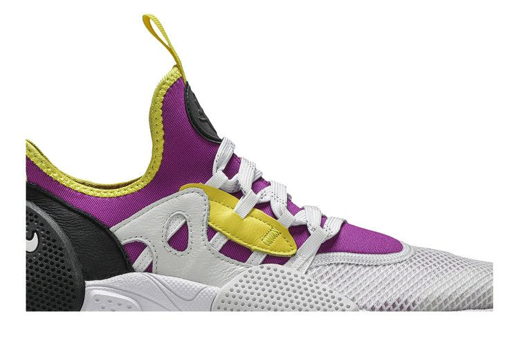 Модель Nike Air Huarache была разработана Тинкером Хэтфилдом и выпущена в 1991 году. Обновленная версия оригинального дизайна, модель Huarache Edge TXT отличается прочными материалами в обтекаемой версии легкого бегуна. Пурпурно-желтая расцветка Air Huarache Edge TXT, дебютировавшая в январе 2019 года, отличается пурпурным неопреновым внутренним рукавом, желтыми акцентами и белой носочной частью.
