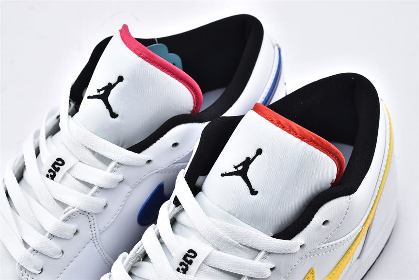 Кроссовки Air Jordan 1 Low Multi Color Swoosh демонстрируют классический силуэт, верх выполнен из белоснежной кожаной основы. Модель Jordan 1 Low имеет на боковых поверхностях Nike Swoosh разных цветов, черный символ Jumpman на нейлоновом язычке и логотип Jordan Wings, вышитый на пяточной части. Белая мидсоль с технологией Air и черная подошва завершает дизайн.- Цвета: White/Multi-Color/Black
