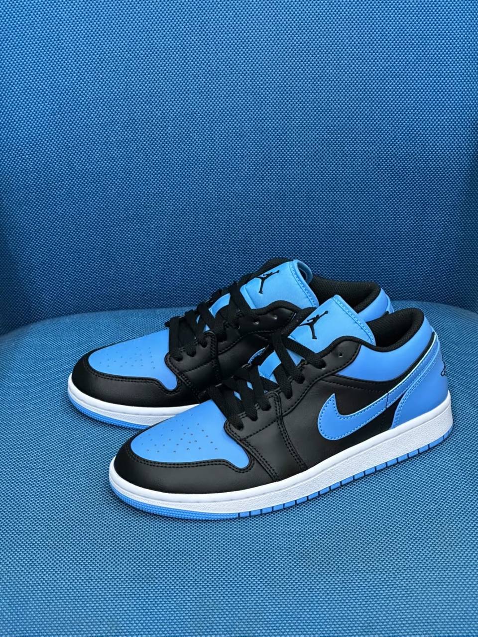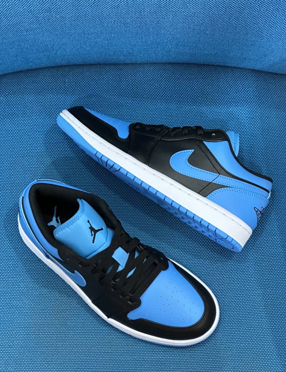 Эти низкие кроссовки Air Jordan 1 Low University Blue выполнены из кожи черного цвета с кожаными накладками цвета University Blue и фирменными сетчатыми язычками. Белая мидсоль на резиновой подошве завершает дизайн.