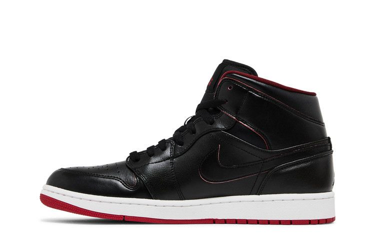 Эти Air Jordan 1 Mid вышли в 2015 году в знакомой расцветке Bred. Модель выполнена из черной кожи с красными акцентами и отделкой, а также белой подошвой и красной подошвой.