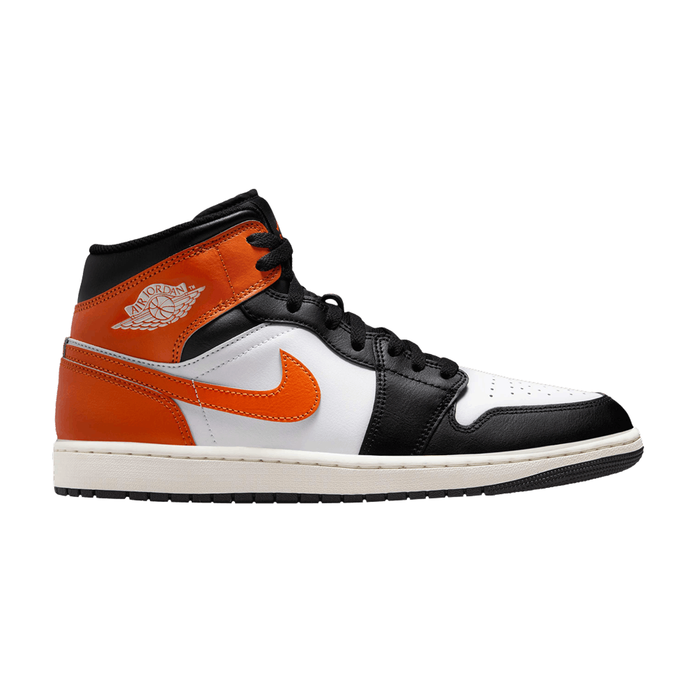 Модель 2025 года Air Jordan 1 Mid "Shattered Backboard" выполнена из гладкой кожи и имеет белый цвет с контрастными черными накладками на передней части стопы, глаз и средней части воротника. Оранжевые акценты в виде морских звезд выделяются на носке, пятке и отвороте воротника, а на боковой стороне красуется тисненый логотип Wings. На черном нейлоновом язычке красуется тканая бирка Jumpman. Кроссовки опираются на белую промежуточную подошву с амортизацией Air-sole.