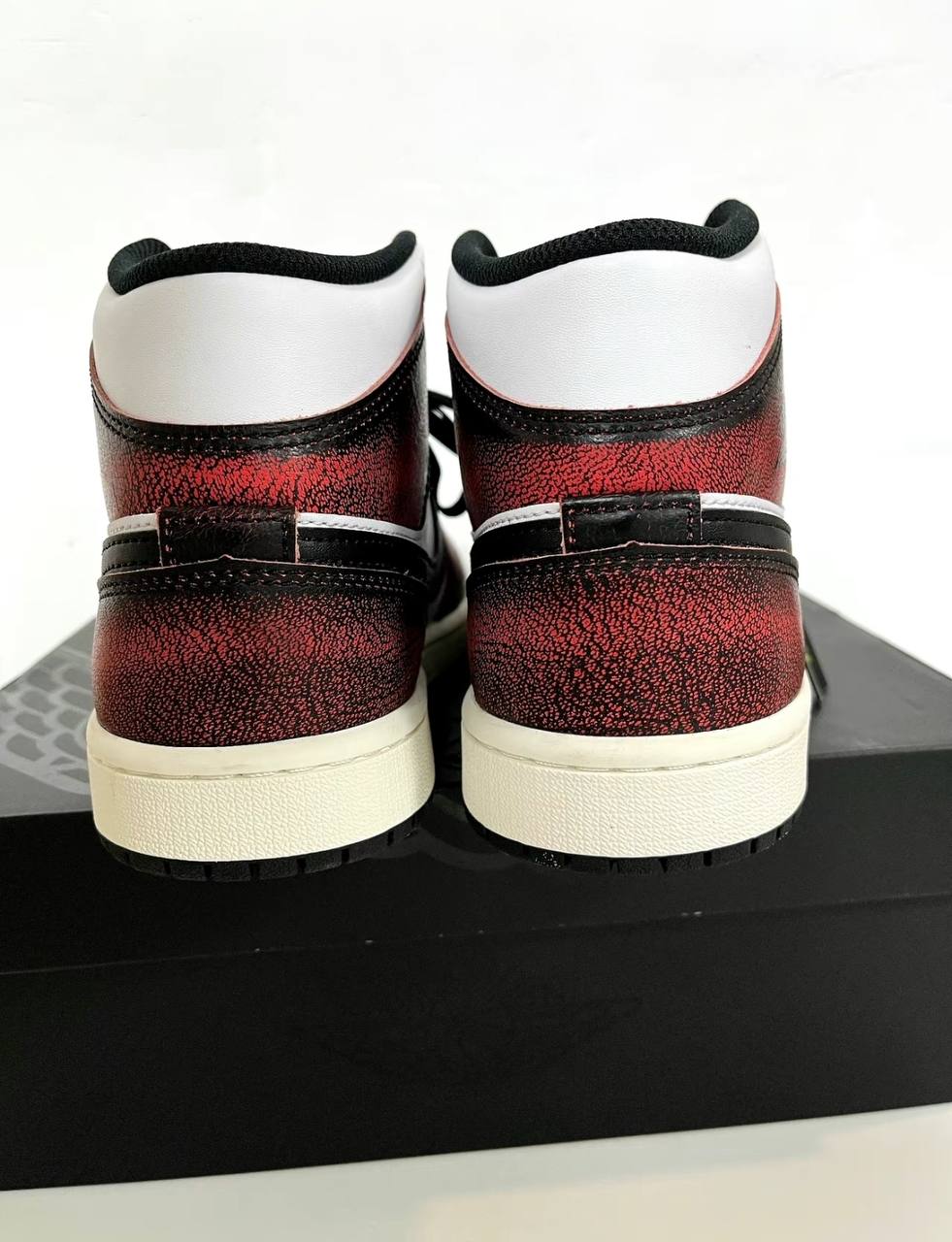 Модель Air Jordan 1 Mid "Wear-Away" имеет чистый белый кожаный верх, подчеркнутый черными накладками, на которых выделяется контрастный красный тон. Дополнительные детали представлены в виде черных нейлоновых язычков, шнурков и Swooshes в средней части стопы, красной вышивки Jumpman на язычках, логотипов Wings в области воротника и печатных стелек. Завершает дизайн обуви белая подошва и черная резиновая подметка.