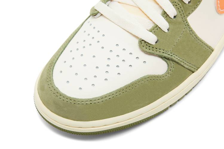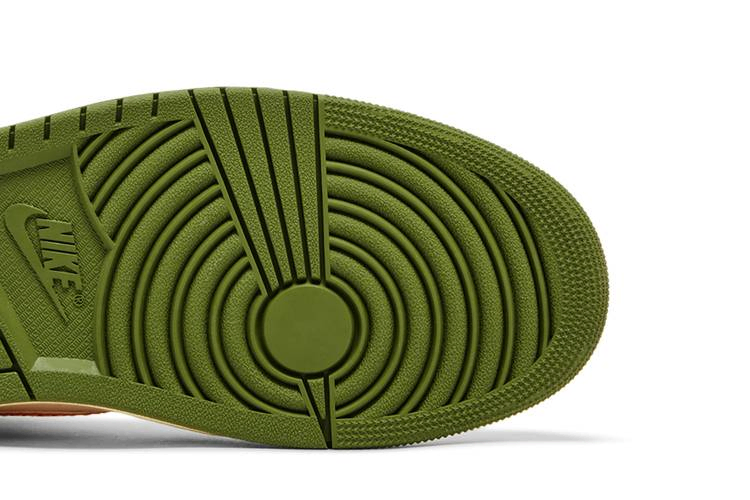 Модель Air Jordan 1 Retro High OG Craft "Celadon" выполнена из белой кожи с оливково-зелеными замшевыми накладками на носочной и пяточной частях. Яркий мандариновый цвет присутствует на мягком воротнике, внутренней подкладке и фирменном логотипе Swoosh, который дополнен контрастной белой строчкой. Стандартные элементы брендинга включают ретро-логотип Wings на боковом клапане воротника и тканую метку Nike Air на язычке из вспененного материала. Состаренная подошва с амортизирующей подошвой Air и зеленой резиновой подошвой.
