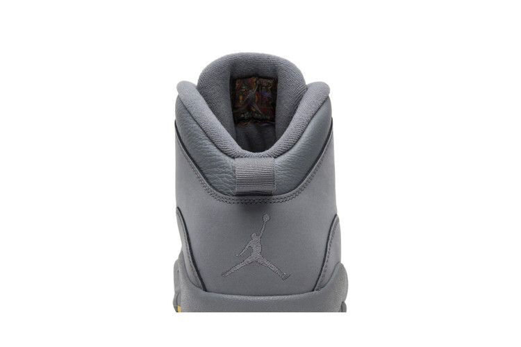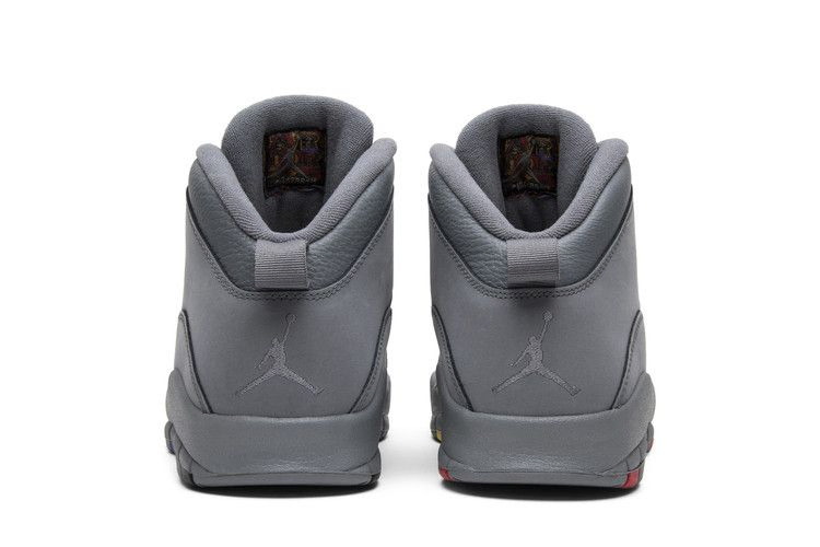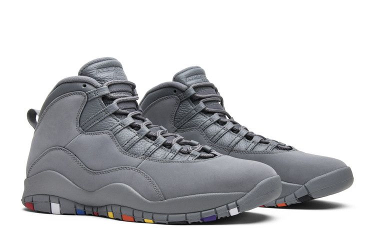 Модель Air Jordan 10 Retro "Cool Grey", выпущенная в январе 2018 года, имеет верх из кожи и нубука Cool Grey, тональную промежуточную подошву и тональную резиновую подошву с синими, белыми, желтыми и красными акцентами.