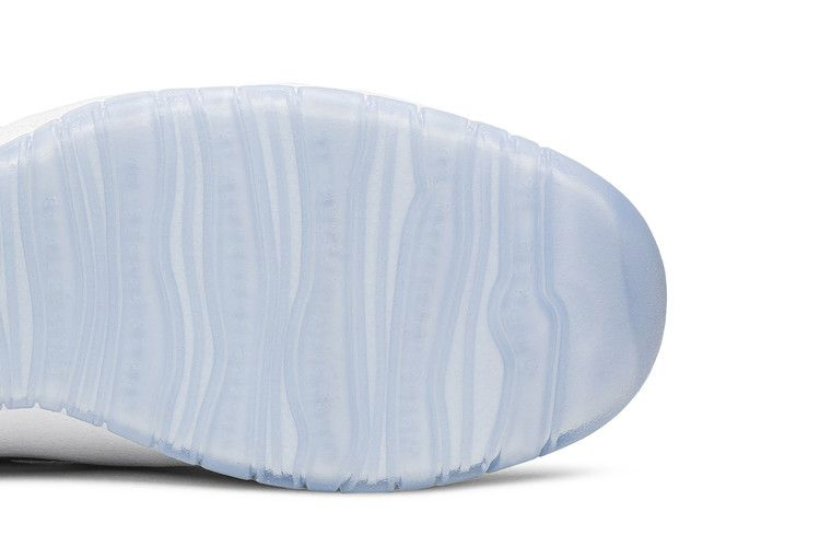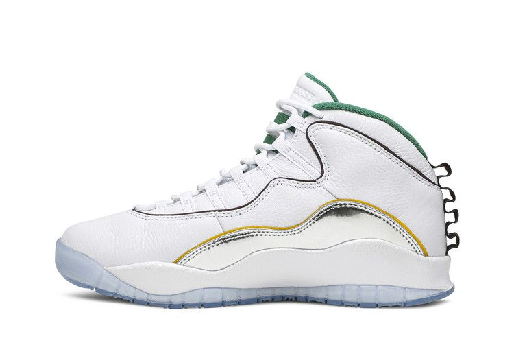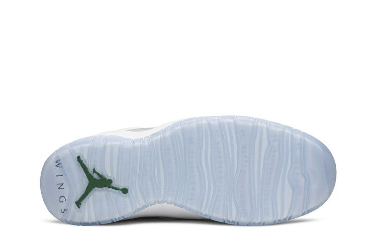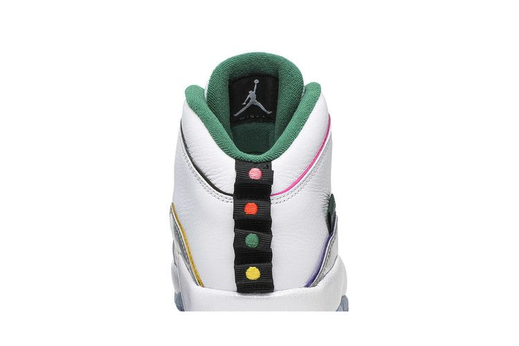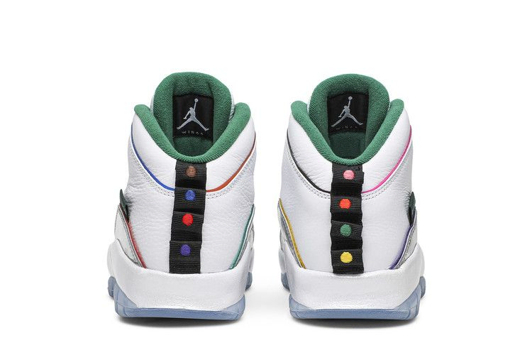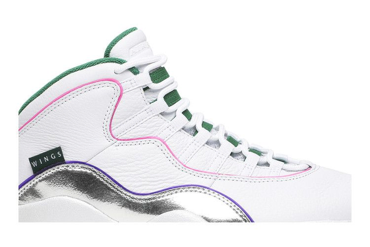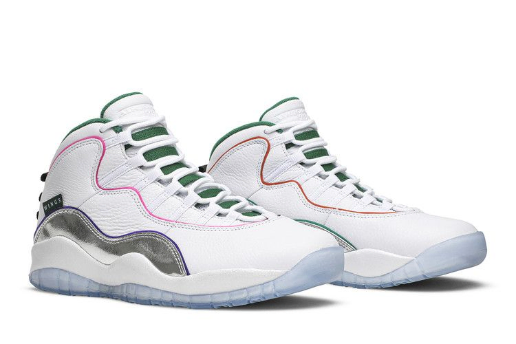 Модель Air Jordan 10 Retro 'Wings', выпущенная в рамках коллекции Jordan Brand, посвященной расширению возможностей образования, имеет верх из белой кожи с металлическими серебристыми брызгами, зеленую подкладку воротника и многоцветную отделку. На задней стороне черная простроченная тесьма проходит по всей длине пяточной панели, украшенной круглыми цветными элементами. Модель стоит на ледяной полупрозрачной резиновой подошве с надписью о начале карьеры MJ.