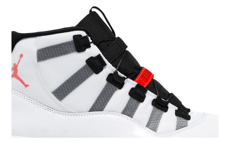 Air Jordan 11 Adapt 'White' EU Charger обновляет культовый силуэт с помощью технологии FitAdapt от Nike. Мотор подключен к кабелям, интегрированным в серию черных ремешков, смоделированных по образцу оригинальных люверсов. Они видны под полупрозрачным текстилем, покрытым белой лакированной кожей. Помимо индивидуальной подгонки, пользователи могут использовать приложение Adapt App, чтобы настроить цвета и мигание светодиодных ламп, расположенных в межподошве. Ледяная полупрозрачная подошва завершает образ оригинального дизайна Тинкера Хэтфилда.