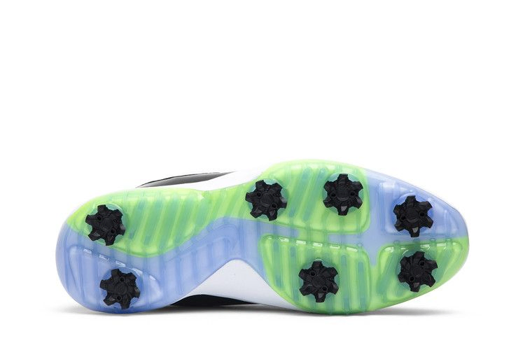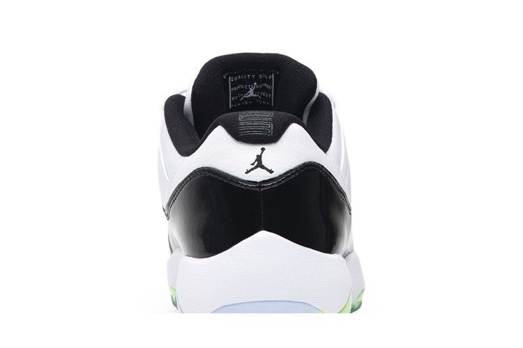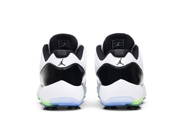 Модель Air Jordan 11 Low Golf 'Concord' переосмысливает культовую расцветку Jordan для использования на гольф-полях. Переделанные в низкую модель, они сохранили общий вид оригинала, подчеркнутый белым кожаным верхом, контрастирующим с глянцевой накладкой из черной лакированной кожи. Белая межподошва поддерживается фирменной полупрозрачной резиновой подошвой 11-й модели, оснащенной съемными шипами для лучшего сцепления с поверхностью.