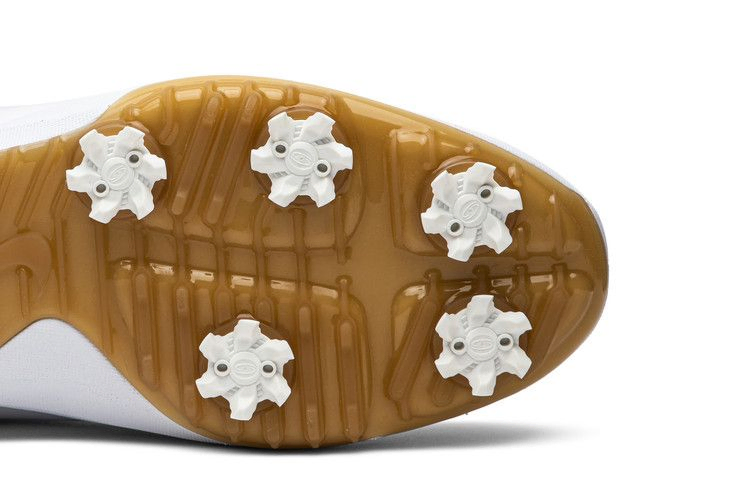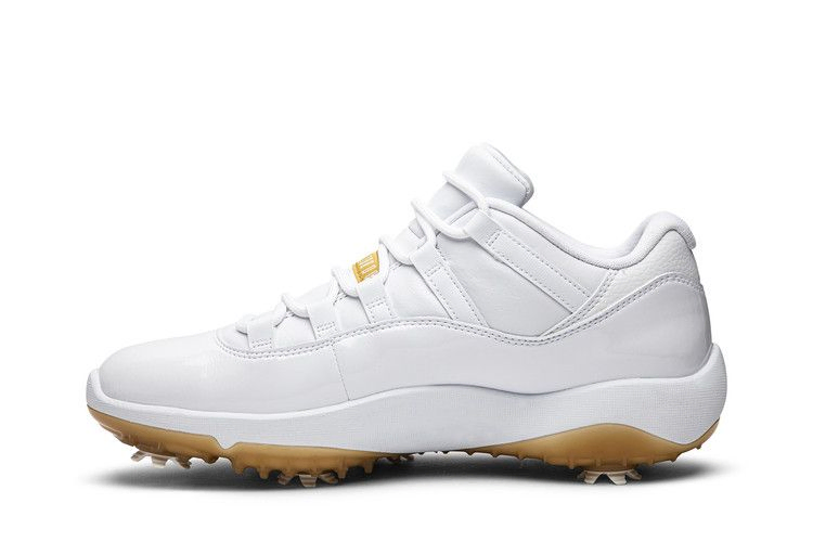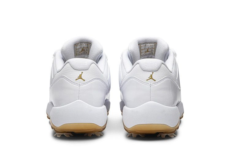 Выпущенные в августе 2019 года, Air Jordan 11 Low Golf "Metallic Gold" превращают силуэт, впервые появившийся на паркете в 1995 году, в обувь для другого увлечения Майкла Джордана - гольфа. В цветовой гамме кроссовок преобладает белый цвет, который присутствует на кожаном верхе, лакированных брызговиках и промежуточной подошве. Золотистые акценты присутствуют на язычке, стельке и пятке с фирменными деталями Jordan. Завершает образ подошва из резины с белыми шипами для гольфа.