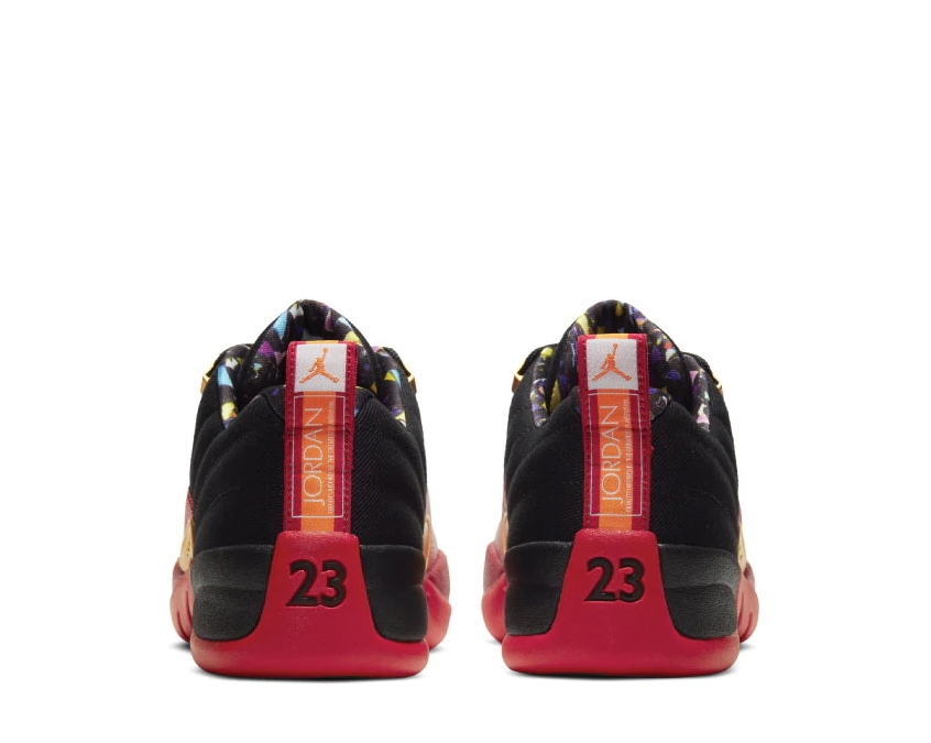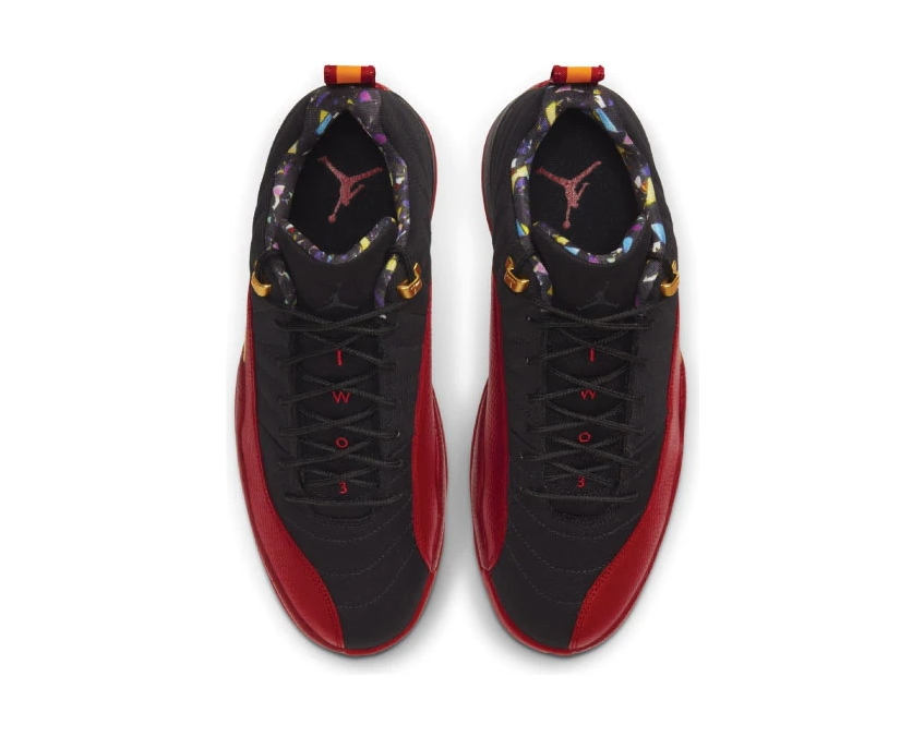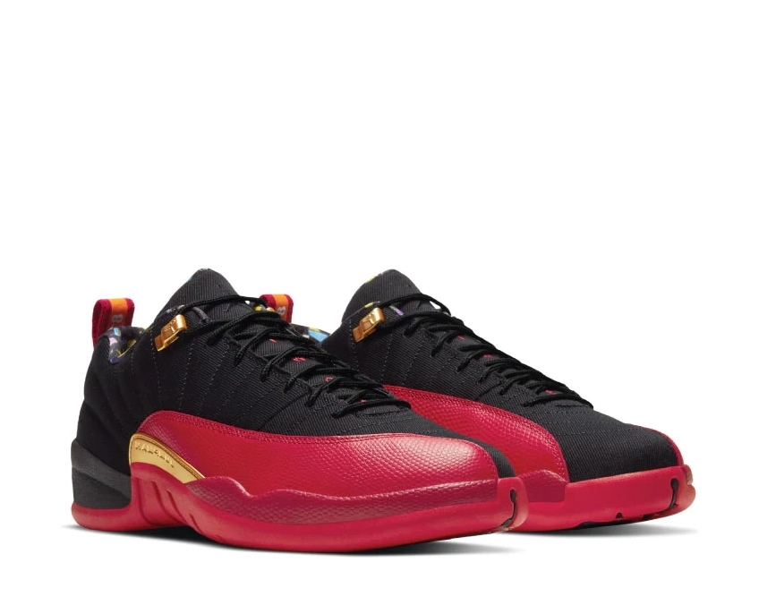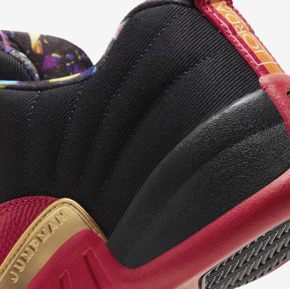 Основная часть верха кроссовок сочетает черную текстильную основу с фирменным брызговиком AJ12 с текстурой ящерицы, окрашенным в тот же малиновый оттенок, что и на резиновой подошве. Металлические золотые акценты присутствуют на накладке на средней части кроссовок и формованных люверсах, а фирменный язычок на пятке Jordan выполнен в красных и оранжевых тонах. Ознакомьтесь с подробными фотографиями и закажите эту расцветку Air Jordan 12 Low SE Super Bowl LV в розничных магазинах или в сервисе Slamdunk- Цвета: Black/Metallic Gold/Varsity Red