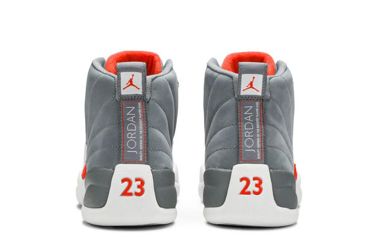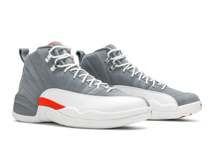 Простая серо-белая цветовая схема подчеркнута вкраплениями оранжевого цвета в Air Jordan 12 Retro 'Cool Grey'. Замшевый верх выполнен в основном в цвете Cool Grey, а текстурированная кожаная подошва и брызговик - в белом. Оранжевая полоса с брендингом Jumpman украшает верхнюю часть и подошву, цвет также присутствует на язычке и на надписи "Two 3", которая проходит по внешней стороне язычка.