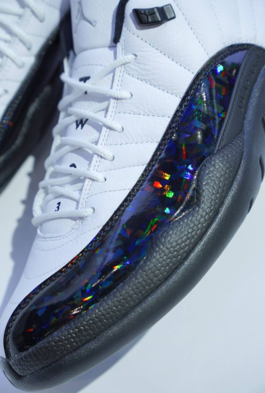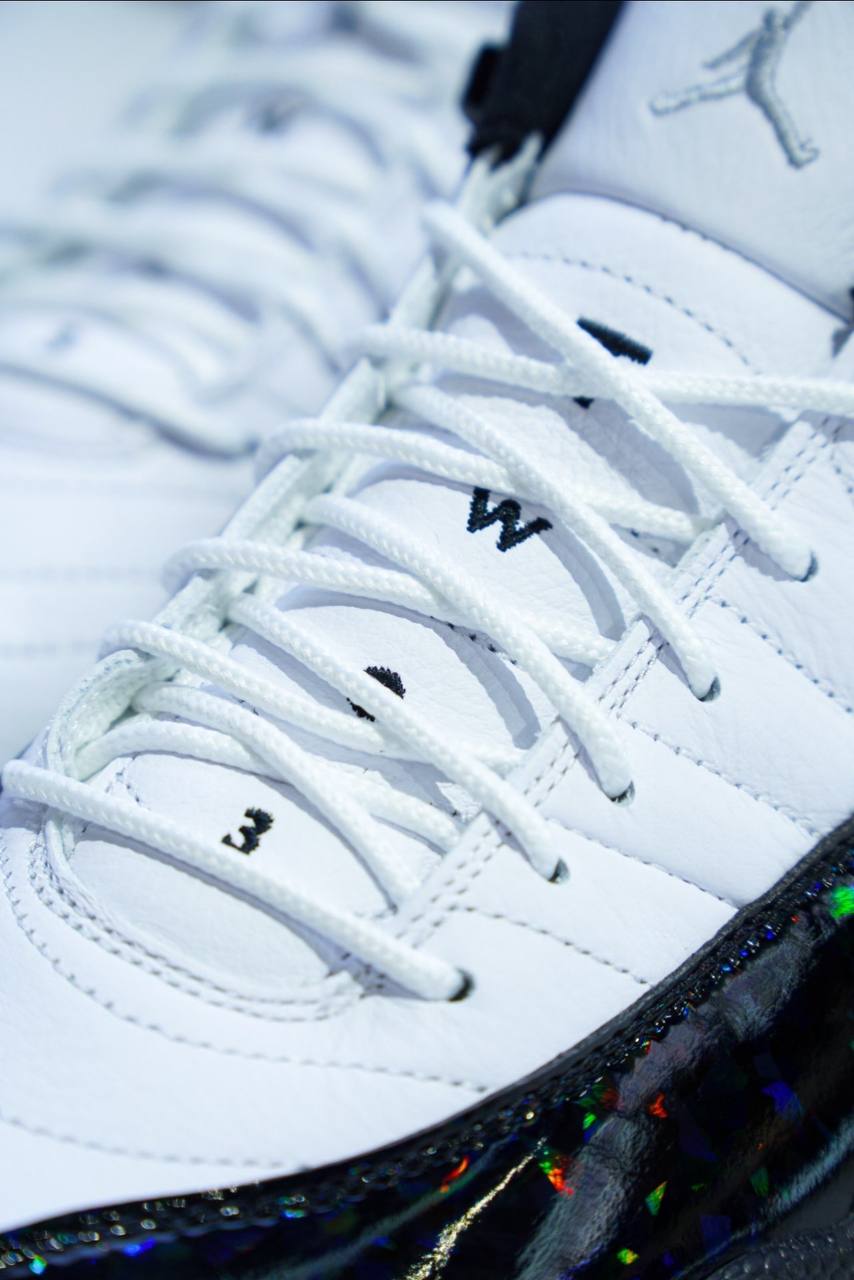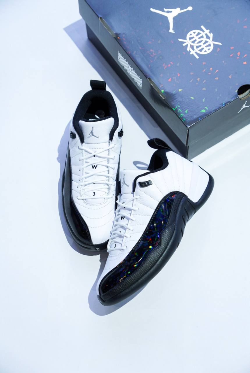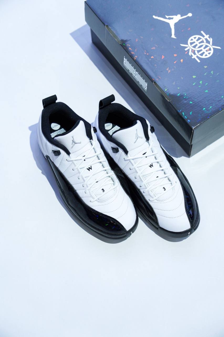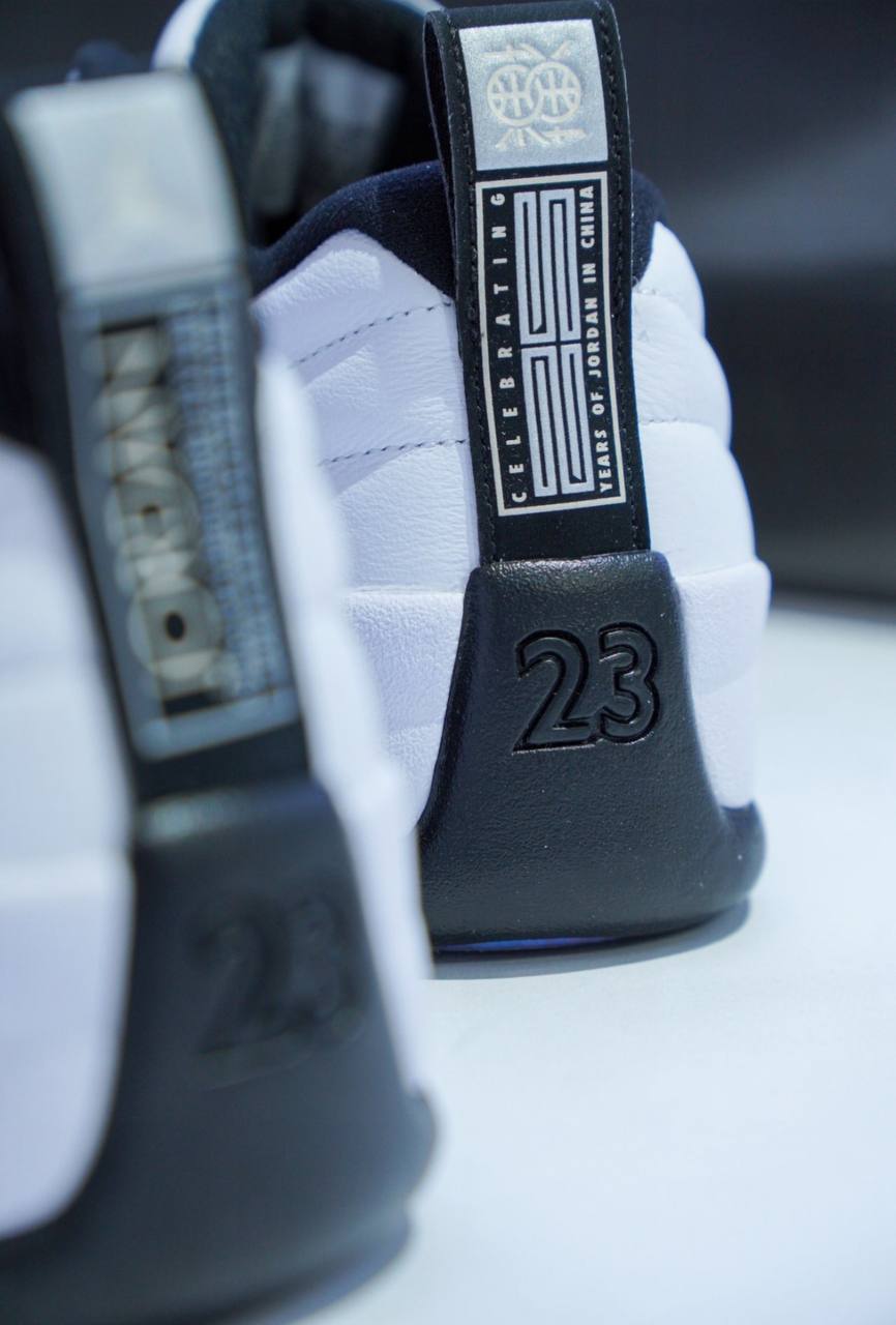 Air Jordan 12 Retro Low выходят в двухцветной расцветке, посвященной 25-летию Jordan Brand в Китае. Белый кожаный верх украшен черными синтетическими брызговиками с голографическими вставками. На язычке серебристой вышивкой вышит значок Jumpman, а на пятке несовпадающие язычки с логотипом Jordan на левом кроссовке и "Celebrating 25 Years of Jordan in China" на правом. Под ногами располагается черная резиновая подошва с фиолетовыми сцепными элементами в виде елочки и открытой пластиной хвостовика из углеродного волокна.