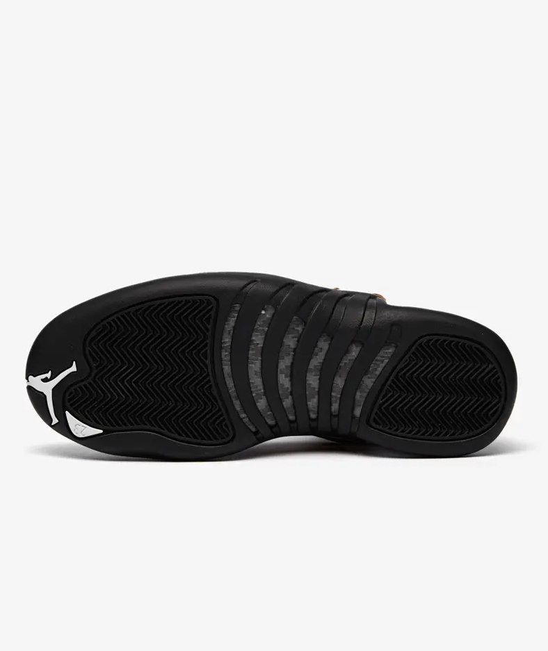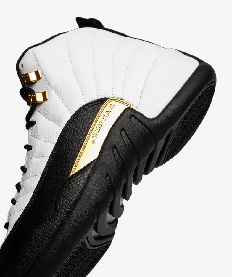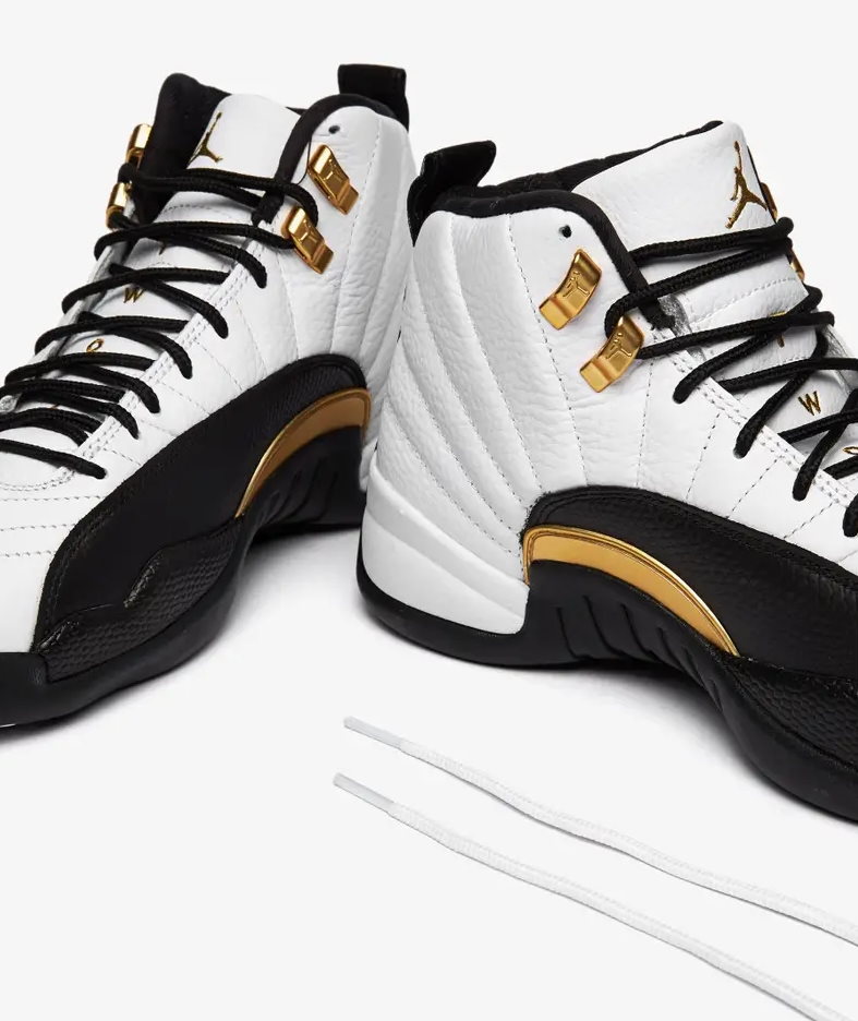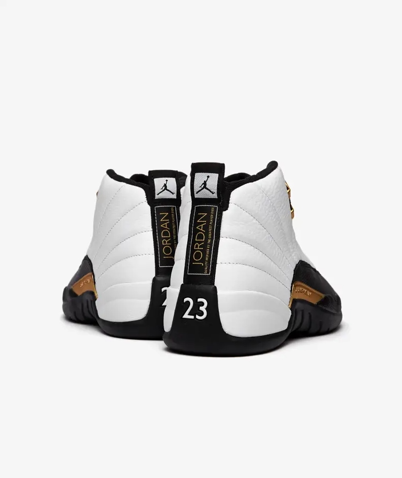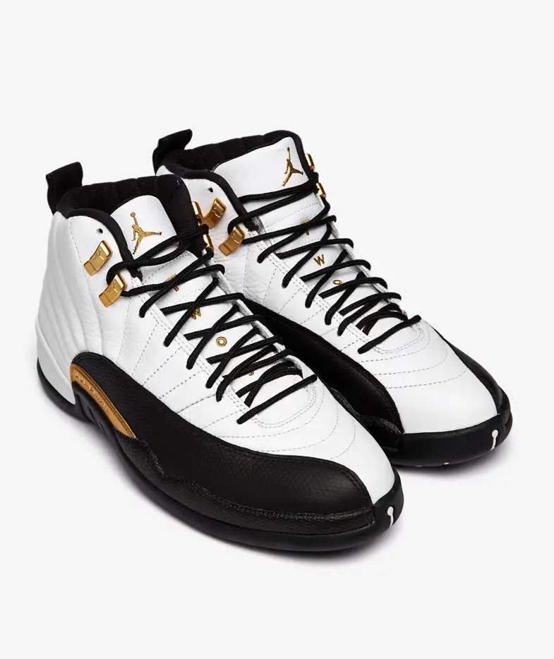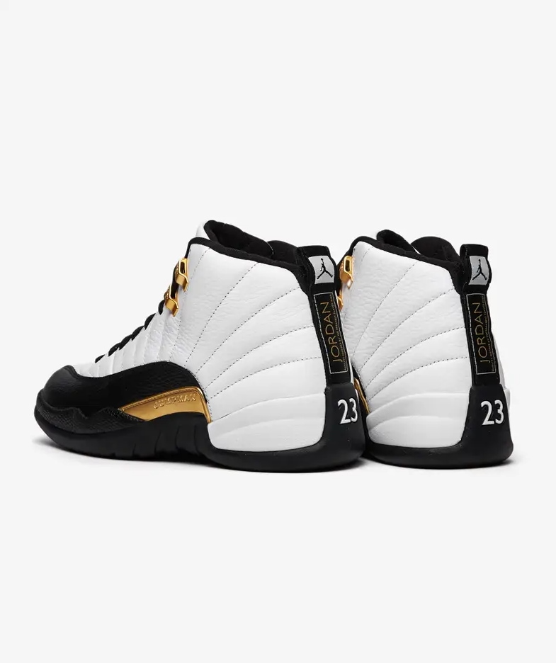 Модель Air Jordan 12 Retro 'Royalty' добавляет позолоченные акценты к двухцветному дизайну, напоминающему цветовую гамму OG 'Taxi' 1996 года. В середине верха используется белый кожаный верх с излучающей строчкой и черные накладки с текстурой ящерицы. Контрастные вставки из металлического золота расположены на формованных верхних проушинах, вставке из ТПУ в средней части стопы и вышитых логотипах Jumpman и Two 3 на язычке. Адаптивная амортизация благодаря полноразмерному блоку Zoom Air. Подошва имеет резиновые тягово-сцепные элементы с рисунком «елочка» и пружинную пластину из углеродного волокна.- Цвета: White/Black/Metallic Gold