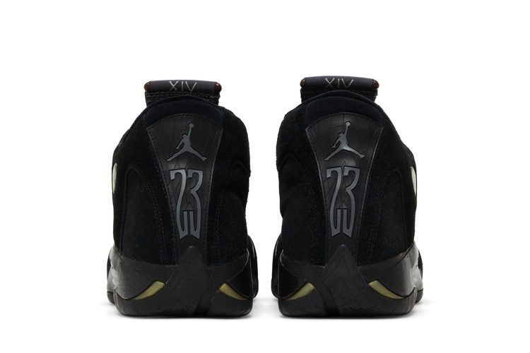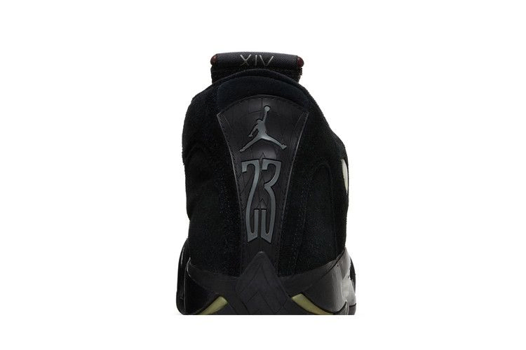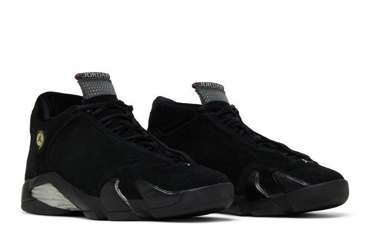 Верхняя часть Air Jordan 14 Retro, выполненная из замши премиум-класса, имеет практически бесшовный дизайн и окрашена в тройной черный цвет. Тонкие серые акценты присутствуют на брендинге Jumpman и решетке межподошвы. В эстетике кроссовок также присутствуют двойные модули Zoom, а вентиляционные отверстия в подошве призваны обеспечить приток воздуха.
