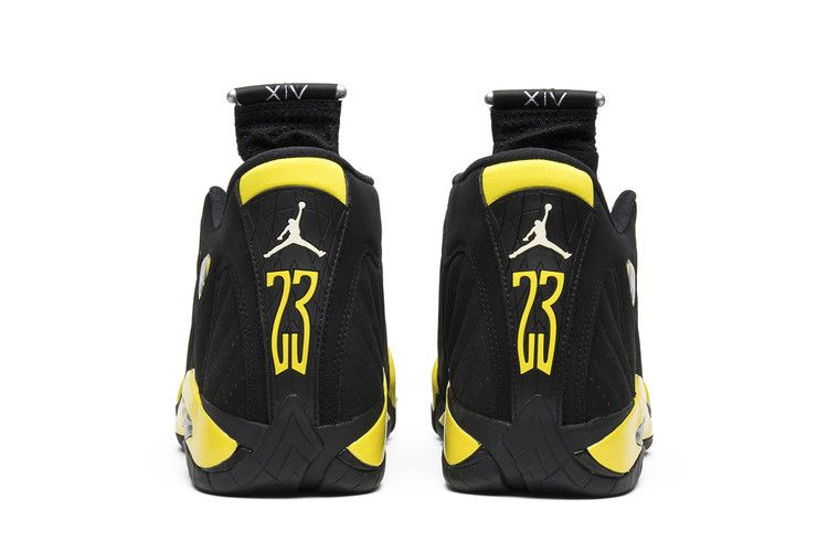 Air Jordan 14, отсутствовавшие с 2012 года, вернулись на полки магазинов в 2014 году в четырех цветовых вариантах: "Sport Blue", "Ferrari", "Black Toe" и "Thunder". Взяв пример с Air Jordan 4 "Thunder", Air Jordan 14 Retro "Thunder" выпускаются в основном с черным замшевым верхом с желтыми акцентами на межподошве и брендинге.