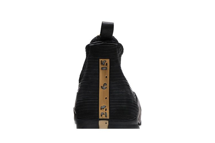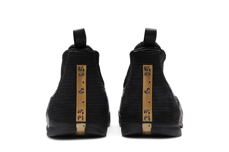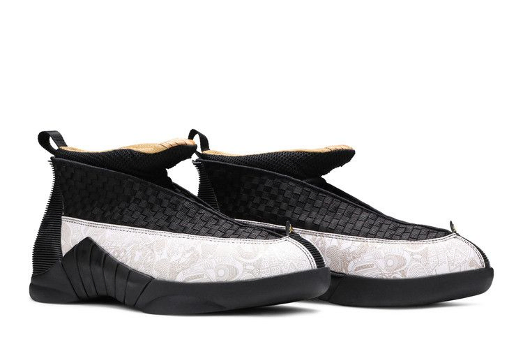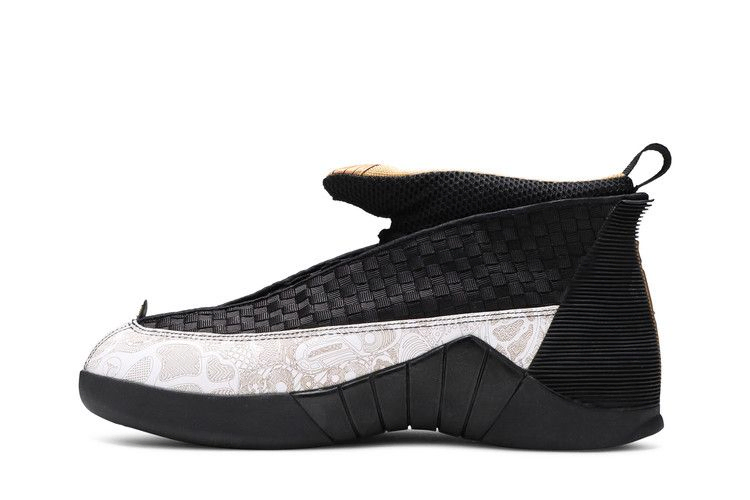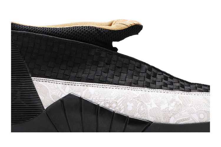Вдохновленные истребителем X-15, Air Jordan 15 имеют нетрадиционный дизайн, подчеркнутый выступающим язычком, который возвышается над плетеным кевларовым верхом. Этот преимущественно черный вариант 2007 года дополнен лазерной гравировкой на белых кожаных накладках, изображающих подошвы различных моделей Jordan. Тонкий брендинг в виде встроенного логотипа Jumpman на пяточной стойке Pebax.
