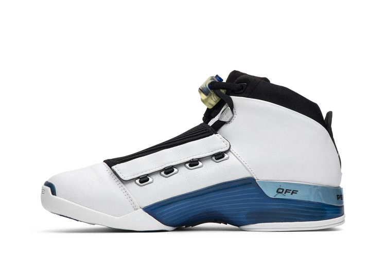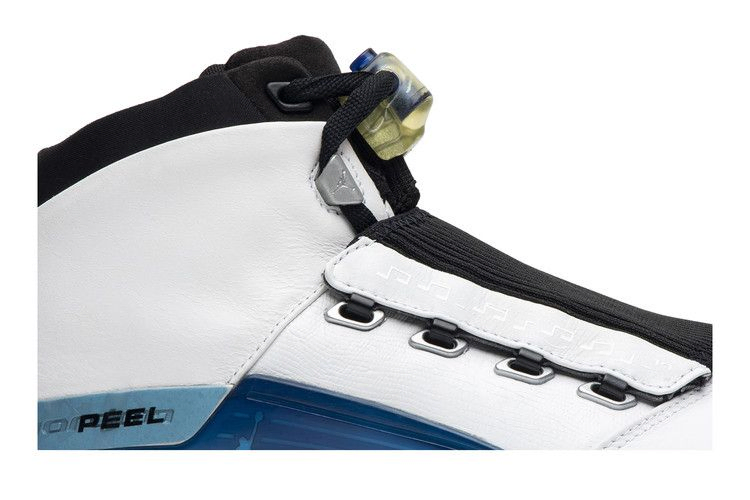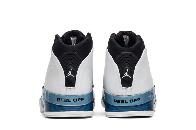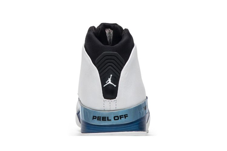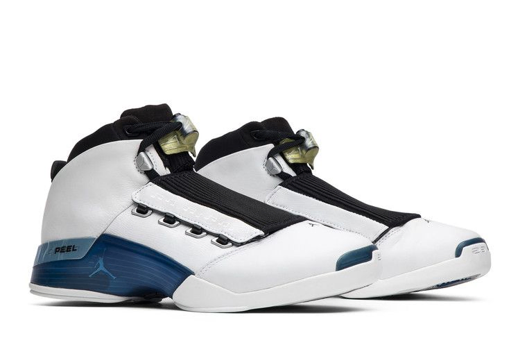 Кроссовки Air Jordan 17 "College Blue" - 17-я фирменная модель от Air Jordan, первая расцветка которой была выпущена в феврале 2002 года. Баскетбольные кроссовки выполнены из белой кожи с акцентами из TPU College Blue, усиливающими защиту носка и свода. Стелька в средней части стопы обеспечивает индивидуальную посадку, а воротник из лайкры с пенной подкладкой повышает комфорт. Стелька из TPU с логотипом Jumpman и полноразмерная пластина голенища с литым блоком Max Air усиливают дизайн.