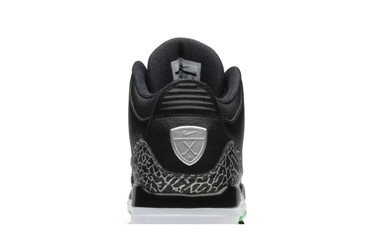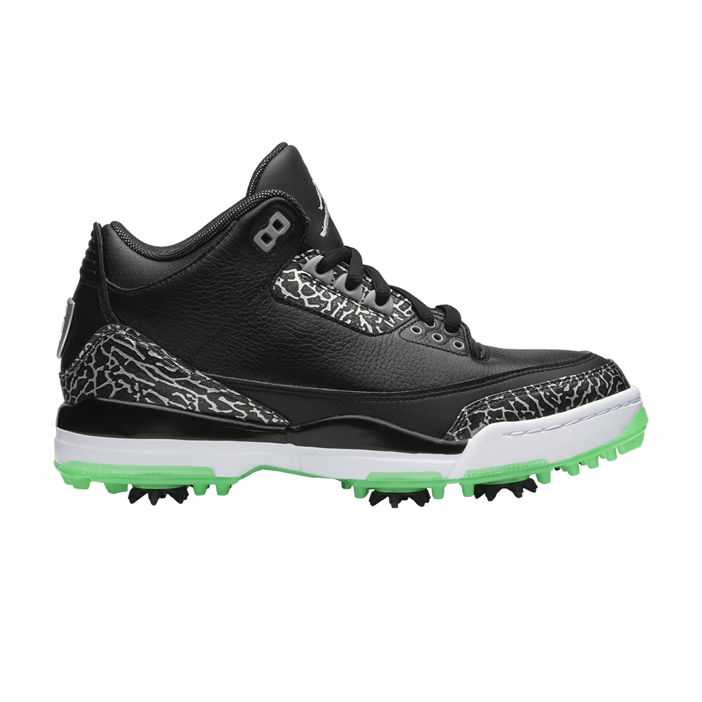 Jordan Brand отмечает 30-летие культовой модели Air Jordan 3 новой моделью кроссовок для гольфа. Модель Air Jordan 3 Retro Golf 'Green Glow' имеет верх из черной галтованной кожи с контрастными слоновьими принтами на носке, пятке и заднике. Верхняя часть кроссовок имеет мягкий воротник, промежуточную подошву Lunarlon и подошву Green Glow. Классический фирменный знак Nike Air заменен на золотой гребень Nike на пятке.