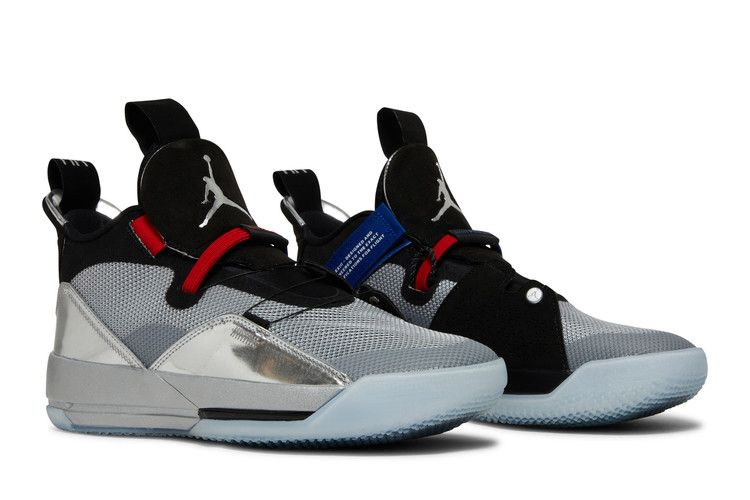 Модель Air Jordan 33 "All Star" посвящена Игре всех звезд НБА 2019 года, которая проходит в родном штате Майкла Джордана - Северной Каролине. Баскетбольные кроссовки выглядят элегантно и современно благодаря серебристому сетчатому верху, покрытому серебристыми металлическими панелями и контрастными черными вставками вокруг язычка, воротника и медиальной стороны передней части стопы. Красные и синие ремешки, встроенные в инновационную систему FastFit, придают обуви яркие краски.