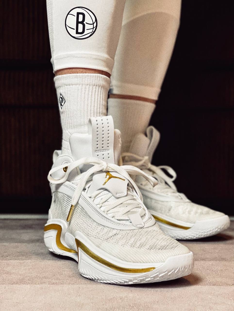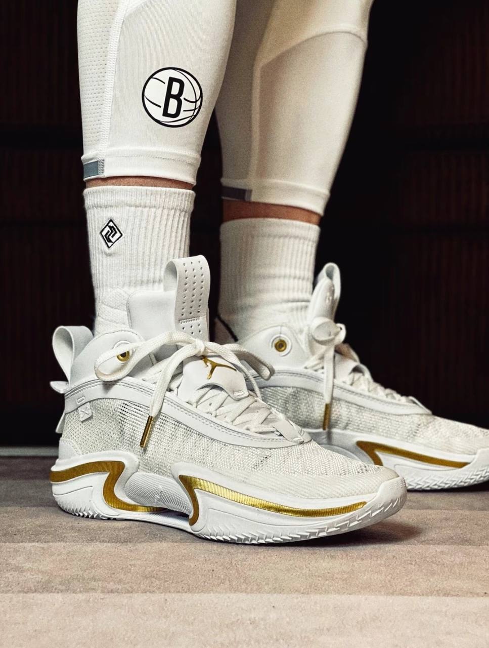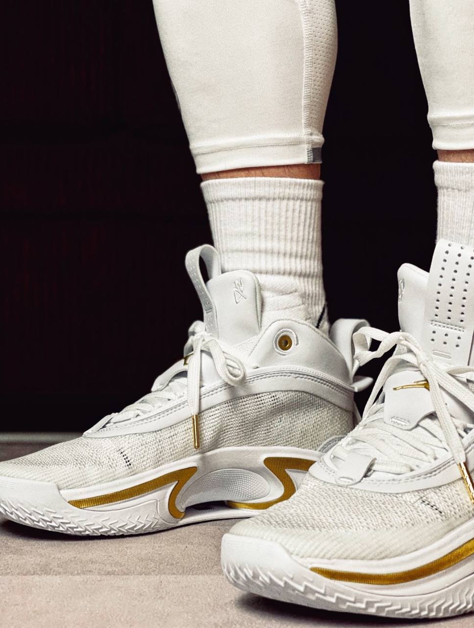 Верх модели Air Jordan 36 Glory изготовлен из легкого, но прочного жаккардового материала. Монохромная белая отделка разбавлена металлическими золотыми акцентами, в том числе на верхних проушинами, усиленных лентой с двумя петлями, украшающими мидсоль, и фирменным знаком Jumpman на паре кружевных накладок. Амортизация обеспечивается полноразмерным Air Zoom Strobel и блоком Zoom Air под передней частью стопы.- Цвета: White/Black/Game Royal/Metallic Gold