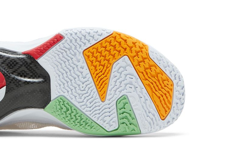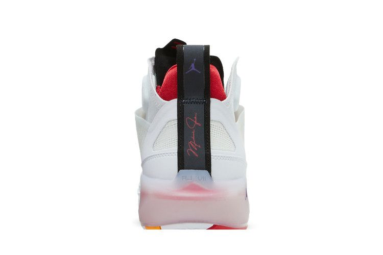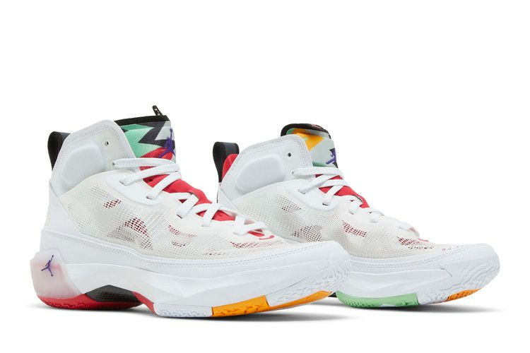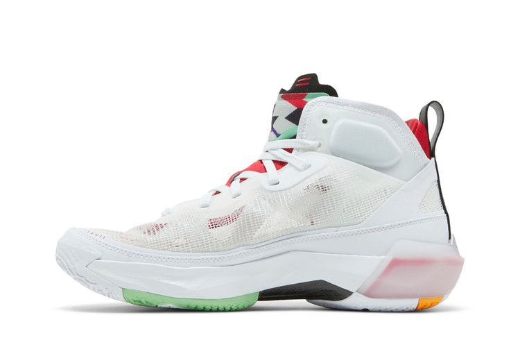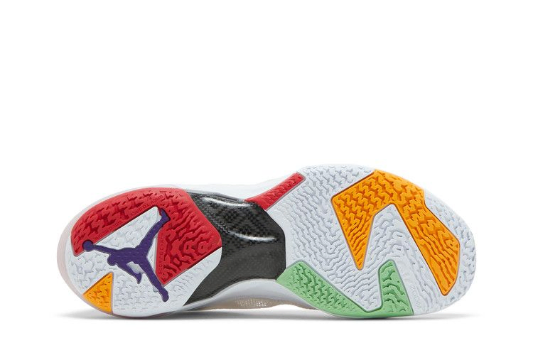 Модель Air Jordan 37 'Hare' вдохновлена одноименным цветовым решением OG Air Jordan 7. Силуэт выполнен из белого материала Lenoweave с прозрачной плетеной структурой, которая показывает экзоскелетную клетку для легкой поддержки. Язычок и резиновая подошва выполнены в ярком многоцветном дизайне, который напоминает об Air Jordan 7. Межподошва сочетает в себе мягкий материал Phylon и пену Formula 23 в пятке, заключенную в клетку из TPU для дополнительной стабильности. Превосходная отзывчивость обеспечивается стробоскопом Zoom Air и дополнительным блоком Zoom Air, расположенным в передней части стопы, а пластина хвостовика из углеродного волокна обеспечивает жесткость на скручивание.