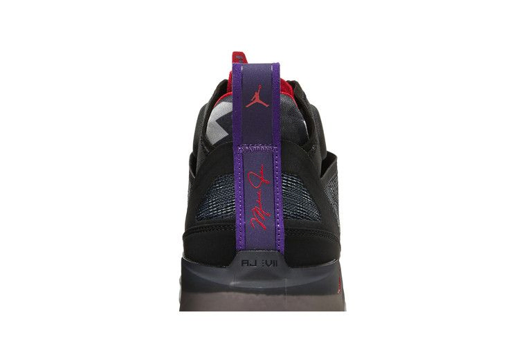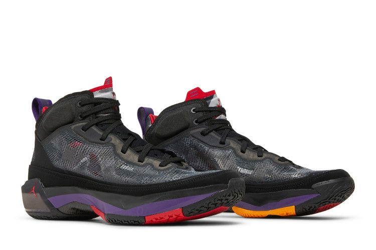 Air Jordan 37 "Raptors" выполнены в знакомой цветовой гамме, вдохновленной OG-версией Air Jordan 7. Верх выполнен из слоев черной ткани Leno-weave, дополнен тональным нубуком и украшен фиолетовым язычком на пятке. Язычок украшает малиновый Jumpman с неровным серым узором, позаимствованным у AJ7. Межподошва состоит из двух блоков Air в носочной части и мягкой пены Formula 23 в пятке. Под подошвой пластина из углеродного волокна придает устойчивость на кручение многоцветной резиновой подошве черного, золотого, красного и фиолетового цветов.